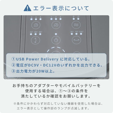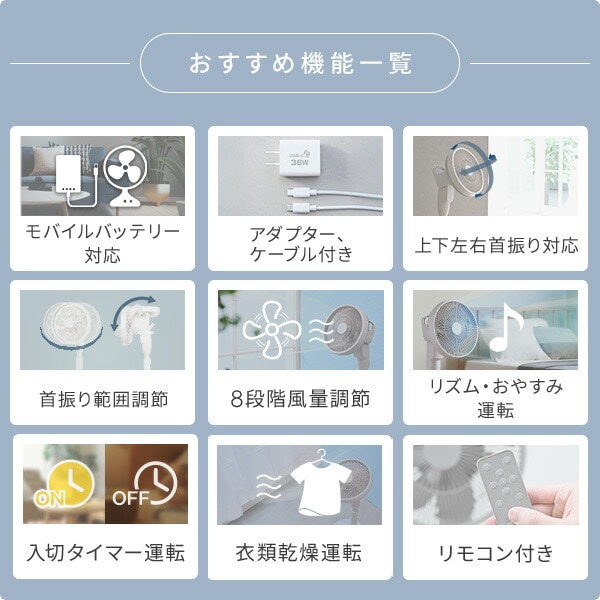 | 商品説明 | ●ACアダプタ入力:AC100-240V(50/60Hz) ●ACアダプタ出力:USB-C DC5V/3A , 9V/3A , 12V/3A , 15V/2.4A , 20V/1.8A ●ACアダプタ合計出力:36W ●本体入力:20W/0.9A(本体は入力のみ) ●消費電力:20W ●電源コード長さ:約1.6m ●電気代目安(1時間あたり):約0.6円(50/60Hz) ●DCモーター搭載 ●羽根:23cm径 7枚 ●風量:8段階 ●Wタイマー搭載:【切】1/2/4h 【入】2/4/6h(3段階) ●リズム風搭載 ●おやすみモード搭載 ●衣類乾燥運転搭載 ●8時間オートOFF機能 ●上下左右自動首振り搭載 ●上下首振り角度調節3段階:30/60/90度 ●左右首振り角度調節3段階:40/70/100度 ●表示部減光機能搭載 ●フルリモコン付属 ●組立不要ですぐに使える ●付属品:ACアダプタ、USB-Cケーブル ●PD対応の電源機器使用可能で電源スペースのない場所でも使える ●PD対応電源機器があれば非常時、災害時にも使えて備えにもなる ●メーカー保証:1年間 |
