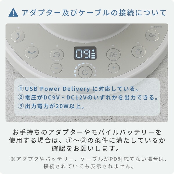 | 商品説明 | ●定格入力:DC9/12V 20W ●内蔵電池:充電式リチウムイオン電池(7.4V/5200mAh) ●ACアダプター:DC5V/3A、9V/2.22A、12V/1.67A(USB PD対応) ●電気代目安(1時間あたり):約0.6円(50/60Hz) ●DCモーター搭載 ●羽根:15cm径 3枚 ●風量:10段階 ●リズム風搭載 ●おやすみモード搭載 ●衣類乾燥モード搭載 ●室温表示搭載 ●電池残量表示搭載 ●入タイマー:1~8時間 ●切タイマー:1~8時間 ●上下左右自動首振り搭載 ●使用時間:風量1(送風時):40時間/風量10(上下左右首振り運転時):2時間 ●充電時間:3時間 ●リモコン付属 ●本体リモコン収納付き ●本体タッチスイッチ ●減光モード搭載 ●メモリー機能搭載 ●お手入れ簡単:工具不要で前面ガード、背面ガード、羽根が取り外し可能 ※前面・背面ガード、羽根は水洗い対応 ●USBケーブル長さ:約1.6m ●付属品:ACアダプタ、USBケーブル(Type-C)、リモコン ●畳数目安:24畳まで ●メーカー保証:1年間 ●USB Power Delivery対応の電圧DC9V or DC12V,出力電力が20W以上の条件を満たした電源機器にて使用可能 ●モバイルバッテリー等を使えば電源のない場所での使用も可能 |
