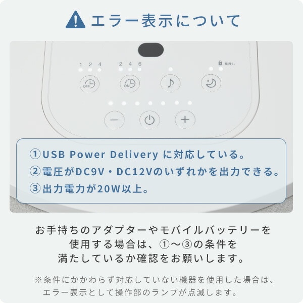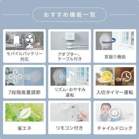 | 商品説明 | ●電源入力(アダプター):100-240V(50/60Hz)/0.6A(Max) ●電源出力(アダプター):USB-C 5.0V-3.0A / 9.0V-2.22A / 12.0V-1.67A ●合計出力(アダプター):20.0W (Max) ●消費電力:16W:USB-C 9.0V / 12.0V ●電源コード長:約1.6m ●電気代目安(1時間あたり):約0.5円(50/60Hz) ●DCモーター搭載 ●風量:7段階 ●リズム風搭載 ●おやすみモード搭載 ●入タイマー:2/4/6時間 ●切タイマー:1/2/4時間 ●左右自動首振り ●風向上下手動角度調節可能 ●チャイルドロック搭載 ●リモコン付属 ●8時間自動OFF ●高さ調節対応 ●付属品:ACアダプタ、Type-C USBケーブル ●メーカー保証:1年間 ※お手持ちのPD対応アダプター・ケーブルを使用する場合、性能や形状、使用状況により運転できないことがあります。 ※2025年7月よりグレー色を追加しております |