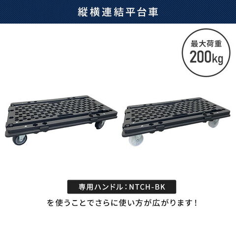 | 商品説明 | ●こちらは平台車単品のページになります ●専用ハンドルNTCH-BKを付けることで、ハンドル台車として使用可能 ●最大荷重:200kg、ハンドル使用時150kgまで ●キャスター:直径7.5cm 自在4個 ●縦横連結可能(平台車としては推奨9台(3×3)まで) ●ハンドルの位置や数を自由に変更可能 ●ハンドルの位置を変えて、どこからでも押せます。 ●荷物の大きさに合わせて自由自在に連結可能 ●ねじれに強いリブ構造 ●ハンドルを外した状態でスタッキング可能(9台まで) ●全キャスター、360度自在に回転するので運搬しやすい ●長尺物の運搬にも最適 |