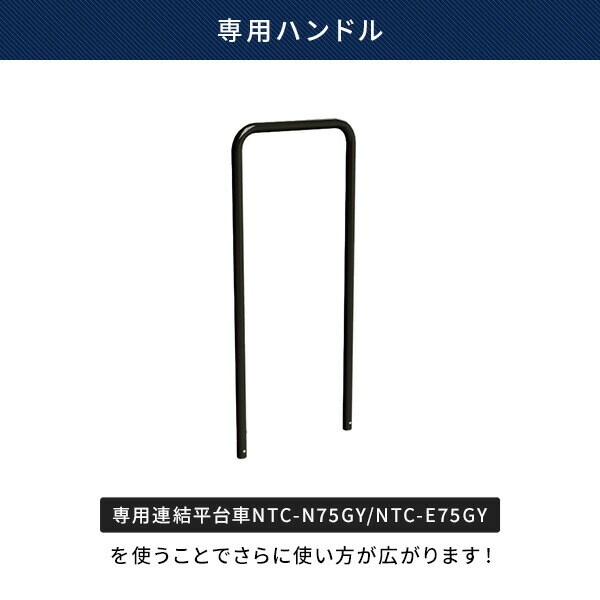| 商品説明 | ●こちらは専用ハンドルのページになります ●専用台車NTC-N75GY/NTC-E75GYに付けることで、ハンドル台車として使用可能 ●最大荷重:200kg、ハンドル使用時150kgまで ●キャスター:直径7.5cm 自在4個 ●縦横連結可能(平台車としては推奨9台(3×3)まで) ●ハンドルの位置や数を自由に変更可能 ●ハンドルの位置を変えて、どこからでも押せます。 ●荷物の大きさに合わせて自由自在に連結可能 ●ねじれに強いリブ構造 ●ハンドルを外した状態でスタッキング可能(9台まで) ●全キャスター、360度自在に回転するので運搬しやすい ●長尺物の運搬にも最適 |
