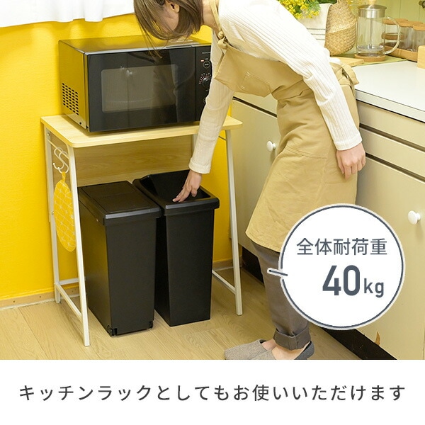 | 商品説明 | ●レンジ台⇔デスクの2way仕様 ●一人暮らしの部屋にも置けるコンパクトサイズ ●キズや水、汚れに強いメラミン樹脂天板採用 ●横揺れを軽減するバックボード付き ●がたつきを軽減するアジャスター付き ●小物等がかけられるS字フック2個付き ●耐荷重:40kg ●工具不要(六角レンチ付属)で組立簡単 |