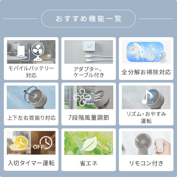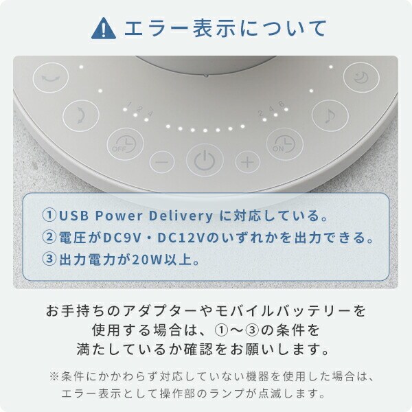 | 商品説明 | ●ACアダプタ入力:AC100-240V(50/60Hz) ●ACアダプタ出力:USB-C DC5V/3A , 9V/2.22A , 12V/1.67A ●ACアダプタ合計出力 : 20W ●本体入力:9V/1.78A , 12V/1.33A(本体は入力のみ) ●消費電力:16W(50/60Hz) ●電気代目安(1時間あたり):約0.5円(50/60Hz) ●コード長さ:約1.6m ●DCモーター搭載 ●風量切替:7段階 ●入タイマー:2/4/6時間 ●切タイマー:1/2/4時間 ●入切タイマー同時設定対応 ●上下左右自動首振り ●リズム風搭載 ●おやすみモード搭載 ●メモリー機能搭載 ●減光機能搭載 ●お手入れ簡単:工具不要で前面ガード取り外し可能 ●リモコン付属 ●PD対応電源機器にて使用可能 ●PD対応モバイルバッテリー対応なので非常時・災害時の備えにもなる ●電源スポットのない場所でもPD対応電源機器があれば使用可能 ●付属品:ACアダプタ、UCB-Cケーブル ●メーカー保証1年付き ●畳数目安:20畳まで ※モバイルバッテリーにつないで運転可能ですが、商品単体で運転することはできません |
