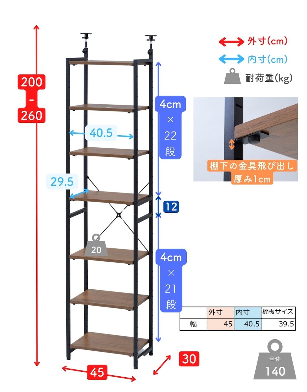 | 商品説明 | ●工具不要(六角レンチ付属) ●大型で背の高い商品です。組み立てにはお二人以上を推奨します。 ●天井まで収納に使える、突っ張り固定式のオープンラック ●全段高さが変えられる可動棚仕様 ●A4ファイルまで対応可能な奥行設計 ●棚板は傷や汚れに強い、メラミン樹脂加工 ●背面にクロスバーで補強 ●脚にはアジャスター付きでガタつきを緩和 ●棚板は約4cm間隔で可動; 上段22段階、下段21段階 ●中央部は約12cmの空間 ●棚板はノブをひねるだけで着脱できる金具仕様 ●棚下金具の飛び出し: 厚み約1cm ●最下段設定時、棚板下から床までの隙間: 7.5cm ●耐荷重: 一段20kg、全体140kg ●棚板内寸:幅40.5 奥行29.5cm、棚板幅39.5cm |