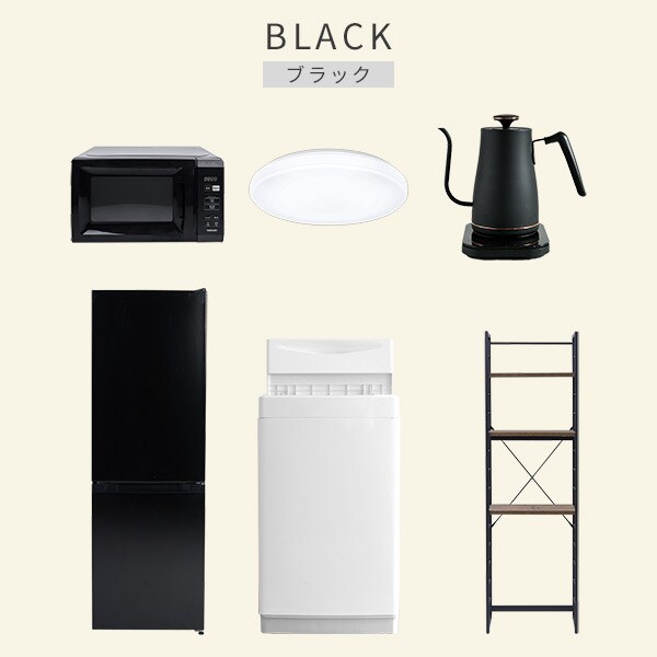| 商品説明 | 【洗濯機】 ●容量:6.0kg(洗濯時)、1.5kg(風乾燥時) ●8つのコース搭載(標準・毛布・おいそぎ・ドライ・ソフト・つけおき・部屋干し・槽洗浄) 【冷蔵庫】 ●容量:157L(冷蔵室109L/冷凍室48L) ●年間消費電力量:270kWh/年 【電子レンジ】 ●容量17L、ターンテーブル ●高周波出力:50Hz(500W、200W相当)、60Hz(650W、500W、200W相当) 【シーリングライト】 ●全光束:3600lm ●30分、60分OFFタイマー付き 【電気温調ケトル】 ●容量:800ml ●温度設定範囲:60-100度の間で1度単位で温度調整可能 【家電収納ラック】 ●棚やコンセントの高さを、モノに合わせて変更可能 ●2口コンセント付き(計1500Wまで)でよく使う家電や雑貨をすっきりひとまとめ ●ラック以外メーカー保証:1年間 |