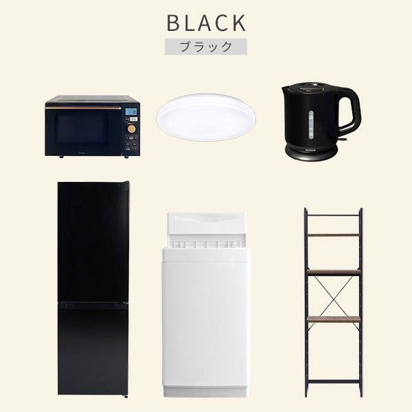 | 商品説明 | 【洗濯機】 ●容量:6.0kg(洗濯時)、1.5kg(風乾燥時) ●8つのコース搭載(標準・毛布・おいそぎ・ドライ・ソフト・つけおき・部屋干し・槽洗浄) 【冷蔵庫】 ●容量:157L(冷蔵室109L/冷凍室48L) ●年間消費電力量:270kWh/年 【オーブンレンジ】 ●容量18L、フラットテーブル ●高周波出力:650W(60Hzのみ)/500W/200W相当 【シーリングライト】 ●全光束:3600lm ●30分、60分OFFタイマー付き 【電気ケトル】 ●容量:1.0L ●空焚き防止機能搭載 【家電収納ラック】 ●棚やコンセントの高さを、モノに合わせて変更可能 ●2口コンセント付き(計1500Wまで)でよく使う家電や雑貨をすっきりひとまとめ ●ラック以外メーカー保証:1年間 |