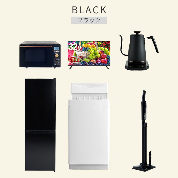 | 商品説明 | 【洗濯機】 ●容量:6.0kg(洗濯時)、1.5kg(風乾燥時) ●8つのコース搭載(標準・毛布・おいそぎ・ドライ・ソフト・つけおき・部屋干し・槽洗浄) 【冷蔵庫】 ●容量:157L(冷蔵室109L/冷凍室48L) ●年間消費電力量:270kWh/年 【オーブンレンジ】 ●容量18L、フラットテーブル ●高周波出力:650W(60Hzのみ)/500W/200W相当 【32型液晶テレビ】 ●サイズ:32V型 ●2K対応ハイビジョン液晶テレビ 【電気温調ケトル】 ●容量:800ml ●温度設定範囲:60-100度の間で1度単位で温度調整可能 【軽量クリーナー】 ●わずか820gの軽量クリーナー ●連続使用時間:(強)約10分、(標準)約25分 ●ラック以外メーカー保証:1年間 |