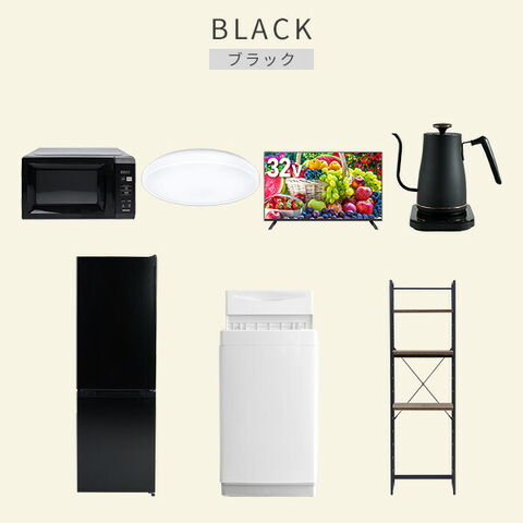 | 商品説明 | 【洗濯機】 ●容量:6.0kg(洗濯時)、1.5kg(風乾燥時) ●8つのコース搭載(標準・毛布・おいそぎ・ドライ・ソフト・つけおき・部屋干し・槽洗浄) 【冷蔵庫】 ●容量:157L(冷蔵室109L/冷凍室48L) ●年間消費電力量:270kWh/年 【電子レンジ】 ●容量17L、ターンテーブル ●高周波出力:50Hz(500W、200W相当)、60Hz(650W、500W、200W相当) 【シーリングライト】 ●全光束:3600lm ●30分、60分OFFタイマー付き 【32型液晶テレビ】 ●サイズ:32V型 ●2K対応ハイビジョン液晶テレビ 【電気温調ケトル】 ●容量:800ml ●温度設定範囲:60-100度の間で1度単位で温度調整可能 【家電収納ラック】 ●棚やコンセントの高さを、モノに合わせて変更可能 ●2口コンセント付き(計1500Wまで)でよく使う家電や雑貨をすっきりひとまとめ ●ラック以外メーカー保証:1年間 |