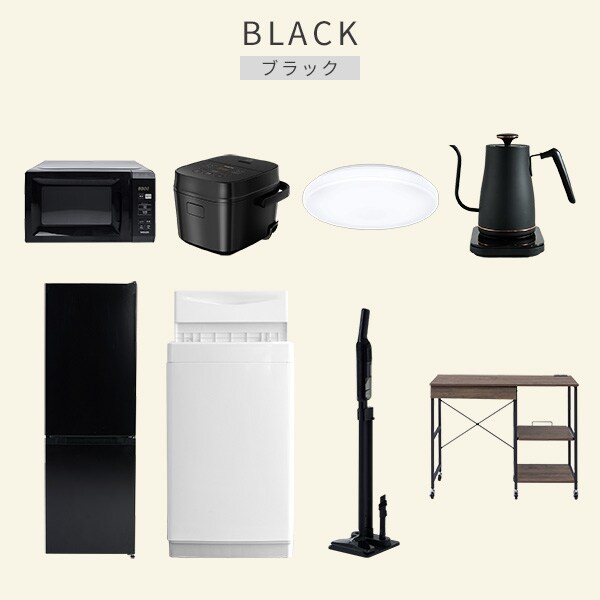 | 商品説明 | 【洗濯機】 ●容量:6.0kg(洗濯時)、1.5kg(風乾燥時) ●8つのコース搭載(標準・毛布・おいそぎ・ドライ・ソフト・つけおき・部屋干し・槽洗浄) 【冷蔵庫】 ●容量:157L(冷蔵室109L/冷凍室48L) ●年間消費電力量:270kWh/年 【電子レンジ】 ●容量17L、ターンテーブル ●高周波出力:50Hz(500W、200W相当)、60Hz(650W、500W、200W相当) 【炊飯器】 ●炊飯容量:3.0合炊き ●8種の炊き分けメニュー:省エネ、白米、早炊き、玄米、無洗米、炊込み、おかゆ、温度調理 【シーリングライト】 ●全光束:3600lm ●30分、60分OFFタイマー付き 【電気温調ケトル】 ●容量:800ml ●温度設定範囲:60-100度の間で1度単位で温度調整可能 【軽量クリーナー】 ●わずか820gの軽量クリーナー ●連続使用時間:(強)約10分、(標準)約25分 【レンジラック】 ●ゴミ箱上を活用する、しっかり頑丈なキッチンラック ●2口コンセント付き(計1500Wまで)でよく使う家電や雑貨をすっきりひとまとめ ●ラック以外メーカー保証:1年間 |