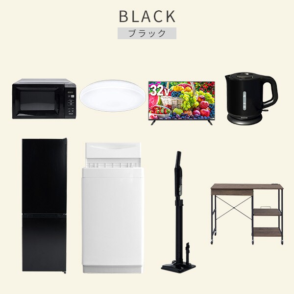| 商品説明 | 【洗濯機】 ●容量:6.0kg(洗濯時)、1.5kg(風乾燥時) ●8つのコース搭載(標準・毛布・おいそぎ・ドライ・ソフト・つけおき・部屋干し・槽洗浄) 【冷蔵庫】 ●容量:157L(冷蔵室109L/冷凍室48L) ●年間消費電力量:270kWh/年 【電子レンジ】 ●容量17L、ターンテーブル ●高周波出力:50Hz(500W、200W相当)、60Hz(650W、500W、200W相当) 【シーリングライト】 ●全光束:3600lm ●30分、60分OFFタイマー付き 【32型液晶テレビ】 ●サイズ:32V型 ●2K対応ハイビジョン液晶テレビ 【電気ケトル】 ●容量:1.0L ●空焚き防止機能搭載 【軽量クリーナー】 ●わずか820gの軽量クリーナー ●連続使用時間:(強)約10分、(標準)約25分 【レンジラック】 ●ゴミ箱上を活用する、しっかり頑丈なキッチンラック ●2口コンセント付き(計1500Wまで)でよく使う家電や雑貨をすっきりひとまとめ ●ラック以外メーカー保証:1年間 |