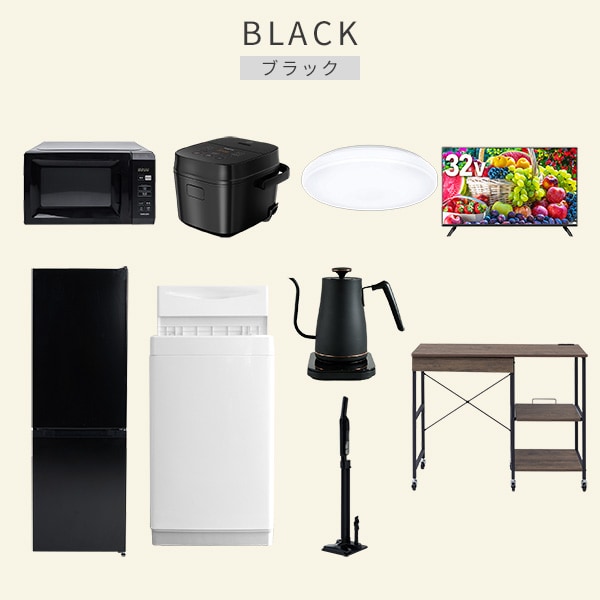 | 商品説明 | 【洗濯機】 ●容量:6.0kg(洗濯時)、1.5kg(風乾燥時) ●8つのコース搭載(標準・毛布・おいそぎ・ドライ・ソフト・つけおき・部屋干し・槽洗浄) 【冷蔵庫】 ●容量:157L(冷蔵室109L/冷凍室48L) ●年間消費電力量:270kWh/年 【電子レンジ】 ●容量17L、ターンテーブル ●高周波出力:50Hz(500W、200W相当)、60Hz(650W、500W、200W相当) 【炊飯器】 ●炊飯容量:3.0合炊き ●8種の炊き分けメニュー:省エネ、白米、早炊き、玄米、無洗米、炊込み、おかゆ、温度調理 【シーリングライト】 ●全光束:3600lm ●30分、60分OFFタイマー付き 【32型液晶テレビ】 ●サイズ:32V型 ●2K対応ハイビジョン液晶テレビ 【電気温調ケトル】 ●容量:800ml ●温度設定範囲:60-100度の間で1度単位で温度調整可能 【軽量クリーナー】 ●わずか820gの軽量クリーナー ●連続使用時間:(強)約10分、(標準)約25分 【レンジラック】 ●ゴミ箱上を活用する、しっかり頑丈なキッチンラック ●2口コンセント付き(計1500Wまで)でよく使う家電や雑貨をすっきりひとまとめ ●ラック以外メーカー保証:1年間 |