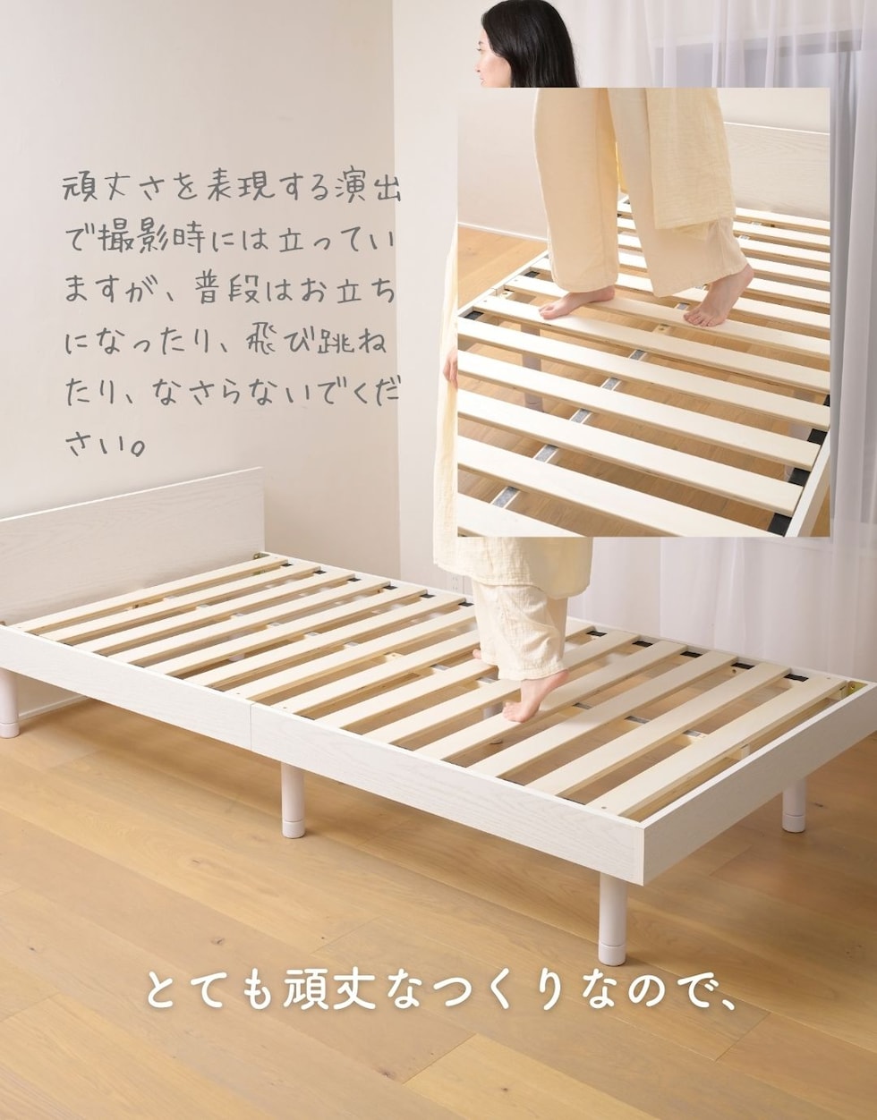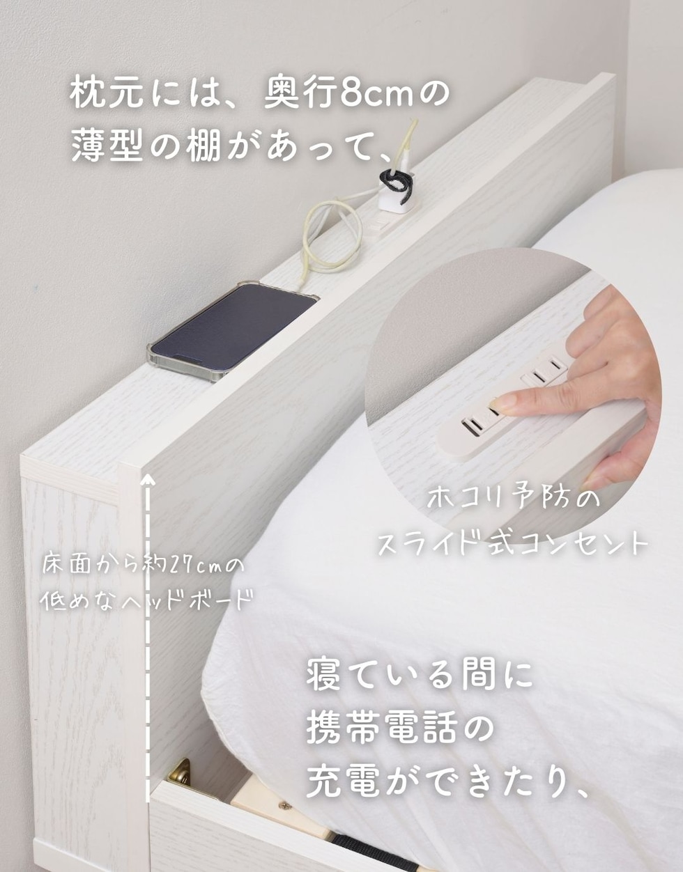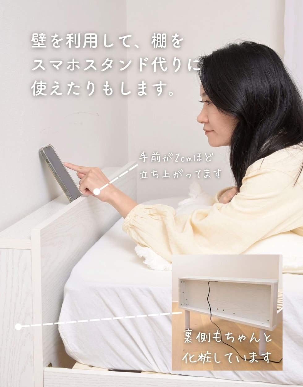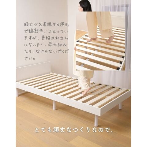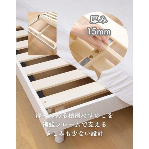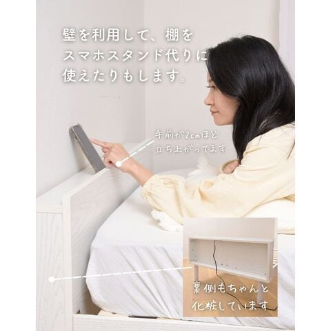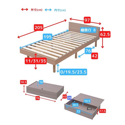 | 商品説明 | ●ベッドフレームは2梱包で重たい荷姿で玄関先までのお届けとなります。搬入、組み立て、設置はお二人以上での作業がおすすめです。 ●プラスドライバーをご用意ください。六角レンチは付属あり。 ●薄型の棚付きヘッドボードのシングルベッド ●棚には2口コンセントが付いていて、枕元でスマホの充電が可能 ●棚は手前がこぼれ止めになっているので、壁に立てかければスタンドとしても活躍 ●棚内寸: 幅97 奥行8cm (中央に11×2cmのコンセントあり) ●こぼれ止め立ち上がり: 2cm ●2口コンセント、合計1500Wまで、コード長さ1.7m ●コンセントは棚のほぼ中央に配置 ●ホコリガードのフタ付きコンセント ●床面の高さは3段階で変更可能: 11/31/35cm ●ローベッドから、収納に使える高さまで、脚をネジって付け替え可能 ●ベッド下サイズ: 高さ0/19.5/23.5 幅79cm ●脚部側の脚~脚内寸: 76cm ●【床面高さ31、35cm時】ロボット掃除機も入ってベッド下の掃除もしやすい、床下貫通設計 ●【床面高さ31、35cm時】ベッド下には衣装ケースも置いて収納スペースとしても活躍 ●床面は厚み15mmのある積層材すのこを、補強フレームで支える、きしみも少ない頑丈設計 ●静止耐荷重: 200kg ※本製品は最大荷重試験の7000N(約700Kg)をクリアした商品です。当社では安全を考慮し、本商品はシングルベッド利用時は耐荷重200Kgに設定しております。耐荷重は保証値ではございません。 ●床面サイズ: 幅97 長さ195cm ●すのこ隙間: 約6cm ●フレームやヘッドボードには、湿気や傷に強い、メラミン樹脂化粧の素材を使用 ●脚部裏に貼り付けるフェルトシール付属 |