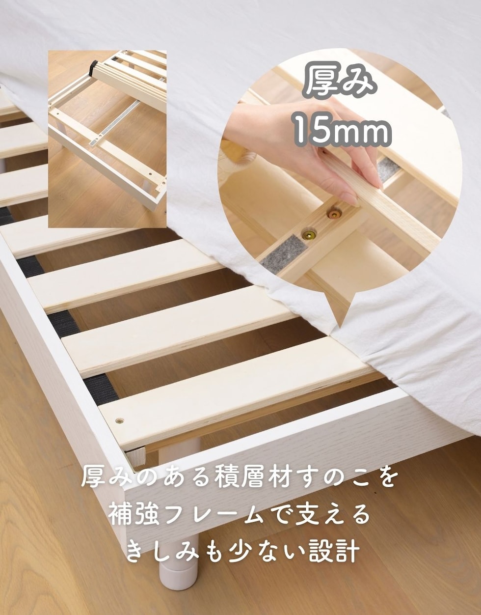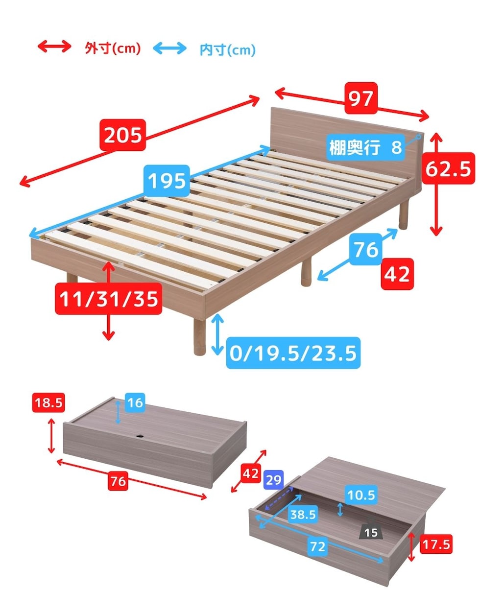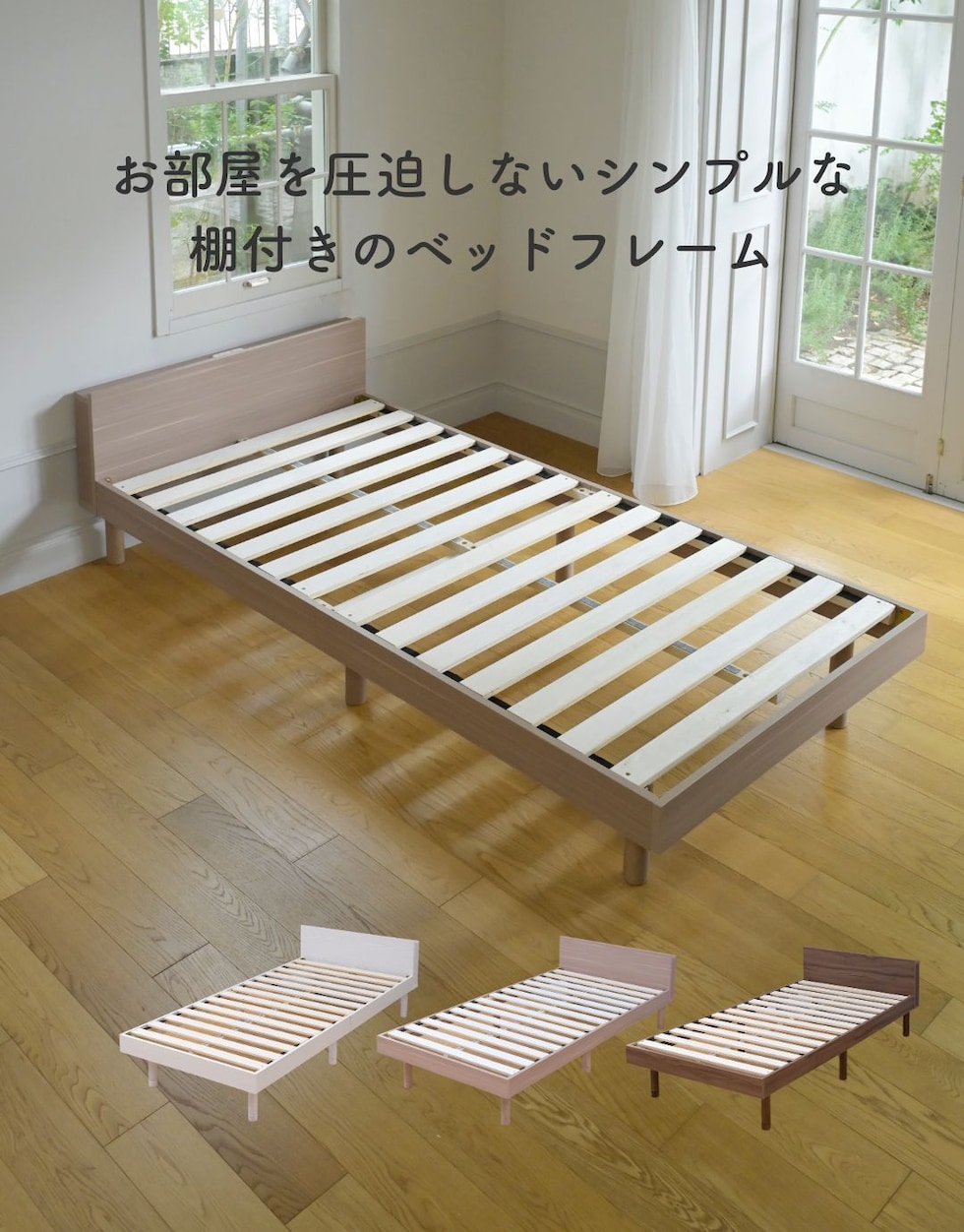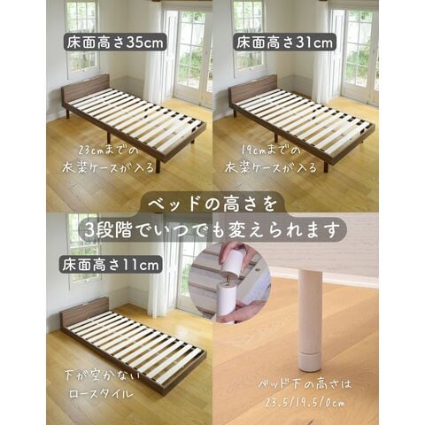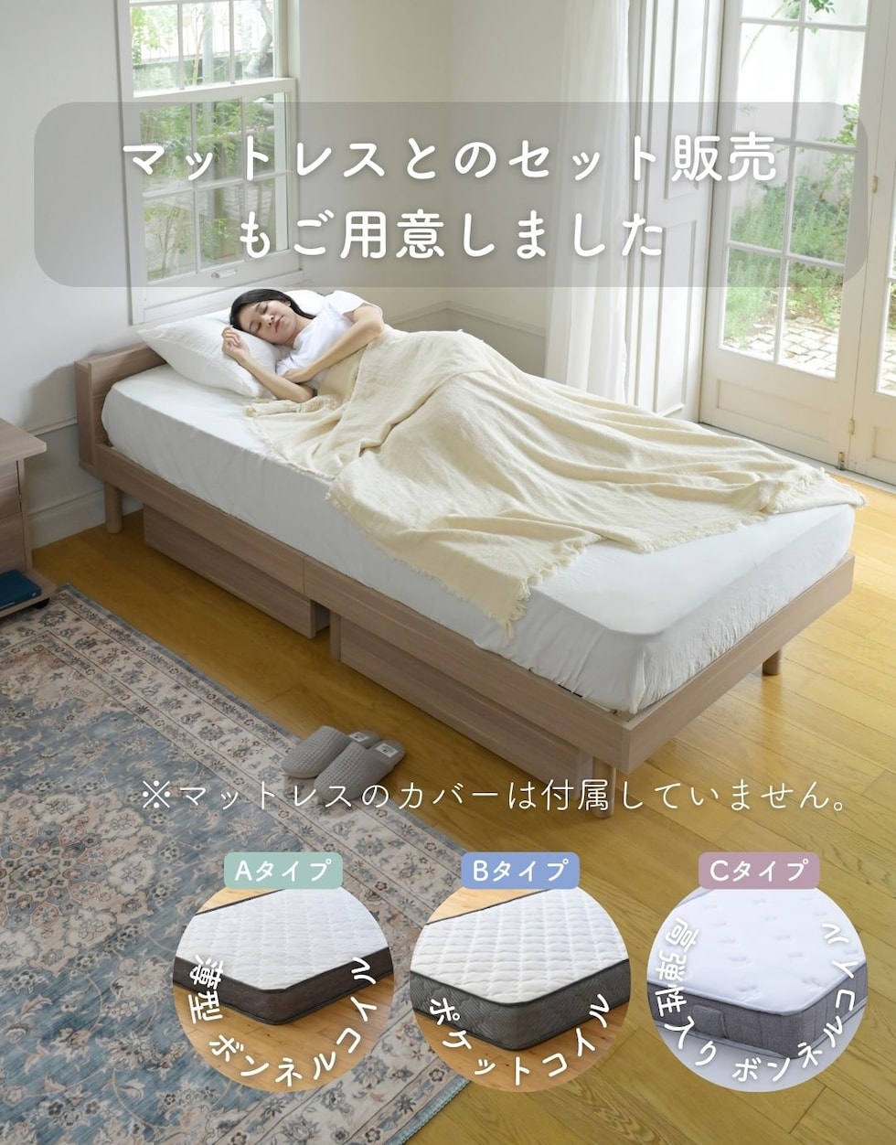 | 商品説明 | ●ベッドフレームは2梱包で重たい荷姿で玄関先までのお届けとなります。搬入、組み立て、設置はお二人以上での作業がおすすめです。 ●プラスドライバーをご用意ください。六角レンチは付属あり。 ●薄型の棚付きヘッドボードのシングルベッド ●棚には2口コンセントが付いていて、枕元でスマホの充電が可能 ●棚は手前がこぼれ止めになっているので、壁に立てかければスタンドとしても活躍 ●棚内寸: 幅97 奥行8cm (中央に11×2cmのコンセントあり) ●こぼれ止め立ち上がり: 2cm ●2口コンセント、合計1500Wまで、コード長さ1.7m ●コンセントは棚のほぼ中央に配置 ●ホコリガードのフタ付きコンセント ●床面の高さは3段階で変更可能: 11/31/35cm ●ローベッドから、収納に使える高さまで、脚をネジって付け替え可能 ●ベッド下サイズ: 高さ0/19.5/23.5 幅79cm ●脚部側の脚~脚内寸: 76cm ●【床面高さ31、35cm時】ロボット掃除機も入ってベッド下の掃除もしやすい、床下貫通設計 ●【床面高さ31、35cm時】ベッド下には衣装ケースも置いて収納スペースとしても活躍 ●床面は厚み15mmのある積層材すのこを、補強フレームで支える、きしみも少ない頑丈設計 ●静止耐荷重: 200kg ※本製品は最大荷重試験の7000N(約700Kg)をクリアした商品です。当社では安全を考慮し、本商品はシングルベッド利用時は耐荷重200Kgに設定しております。耐荷重は保証値ではございません。 ●床面サイズ: 幅97 長さ195cm ●すのこ隙間: 約6cm ●フレームやヘッドボードには、湿気や傷に強い、メラミン樹脂化粧の素材を使用 ●脚部裏に貼り付けるフェルトシール付属 |