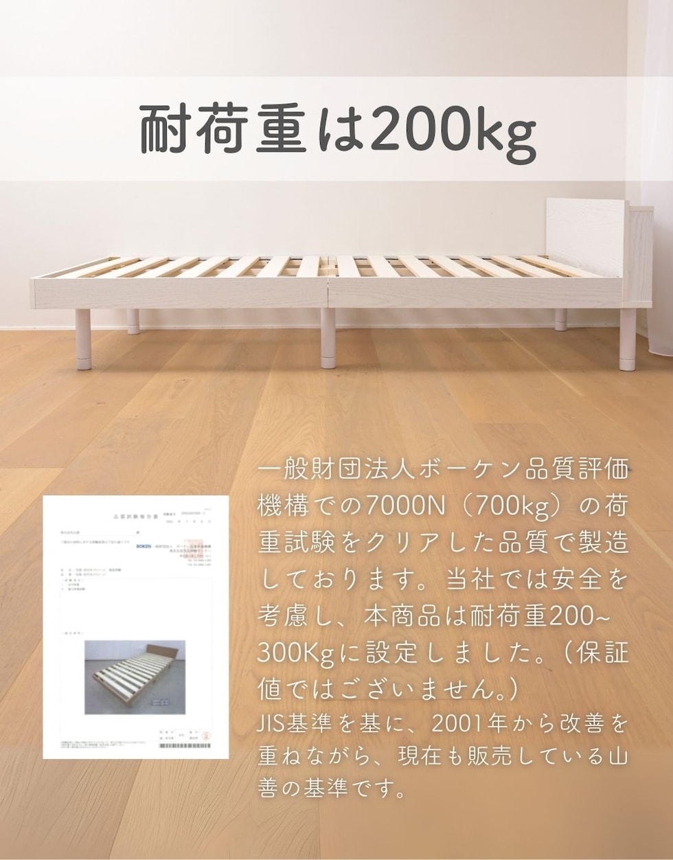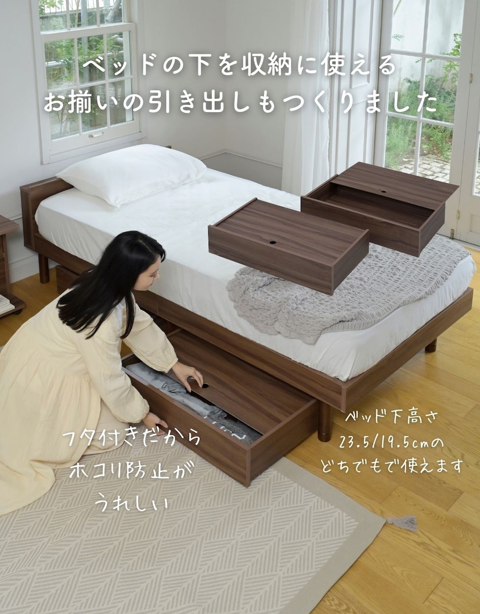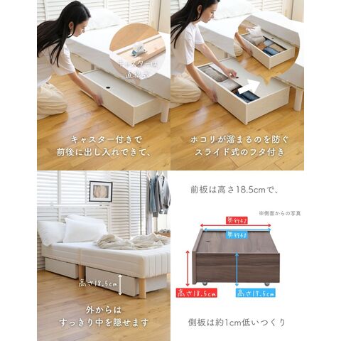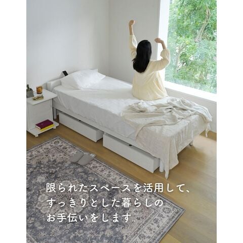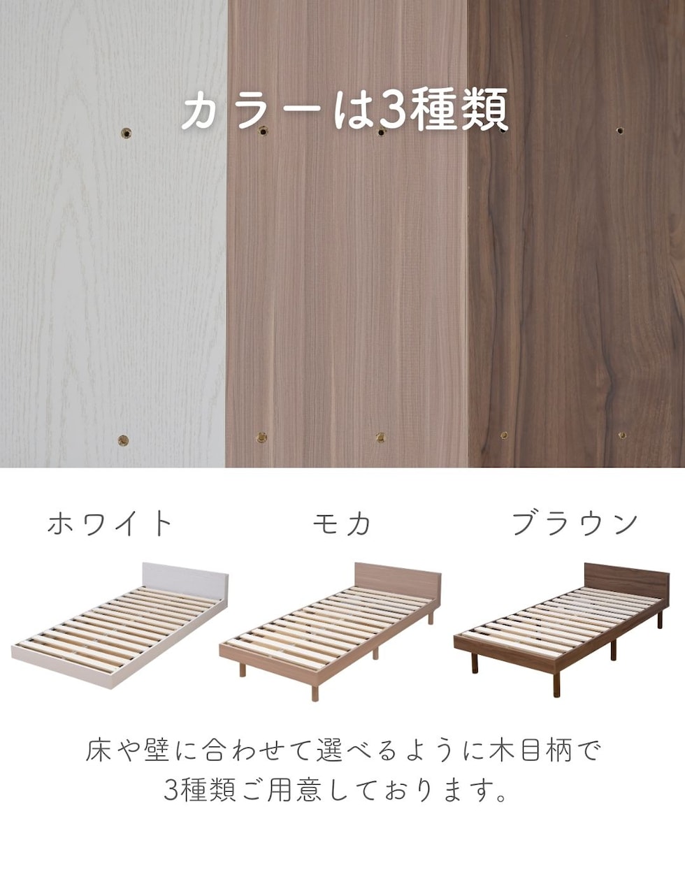 | 商品説明 | ●ベッドフレームは2梱包で重たい荷姿で玄関先までのお届けとなります。搬入、組み立て、設置はお二人以上での作業がおすすめです。 ●プラスドライバーをご用意ください。六角レンチは付属あり。 ●薄型の棚付きヘッドボードのシングルベッド ●棚には2口コンセントが付いていて、枕元でスマホの充電が可能 ●棚は手前がこぼれ止めになっているので、壁に立てかければスタンドとしても活躍 ●棚内寸: 幅97 奥行8cm (中央に11×2cmのコンセントあり) ●こぼれ止め立ち上がり: 2cm ●2口コンセント、合計1500Wまで、コード長さ1.7m ●コンセントは棚のほぼ中央に配置 ●ホコリガードのフタ付きコンセント ●床面の高さは3段階で変更可能: 11/31/35cm ●ローベッドから、収納に使える高さまで、脚をネジって付け替え可能 ●ベッド下サイズ: 高さ0/19.5/23.5 幅79cm ●脚部側の脚~脚内寸: 76cm ●【床面高さ31、35cm時】ロボット掃除機も入ってベッド下の掃除もしやすい、床下貫通設計 ●【床面高さ31、35cm時】ベッド下には衣装ケースも置いて収納スペースとしても活躍 ●床面は厚み15mmのある積層材すのこを、補強フレームで支える、きしみも少ない頑丈設計 ●静止耐荷重: 200kg ※本製品は最大荷重試験の7000N(約700Kg)をクリアした商品です。当社では安全を考慮し、本商品はシングルベッド利用時は耐荷重200Kgに設定しております。耐荷重は保証値ではございません。 ●床面サイズ: 幅97 長さ195cm ●すのこ隙間: 約6cm ●フレームやヘッドボードには、湿気や傷に強い、メラミン樹脂化粧の素材を使用 ●脚部裏に貼り付けるフェルトシール付属 |
