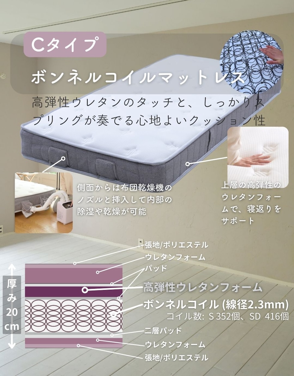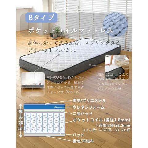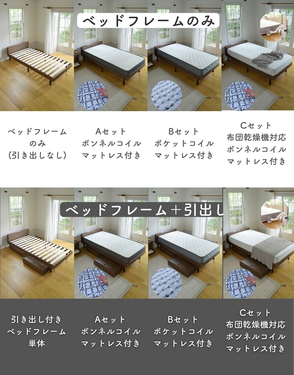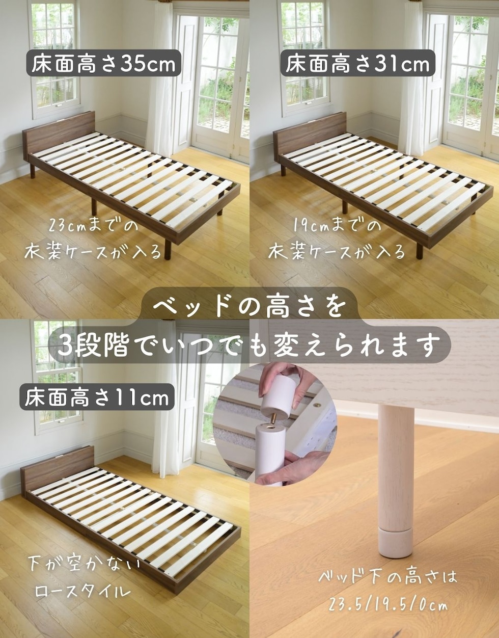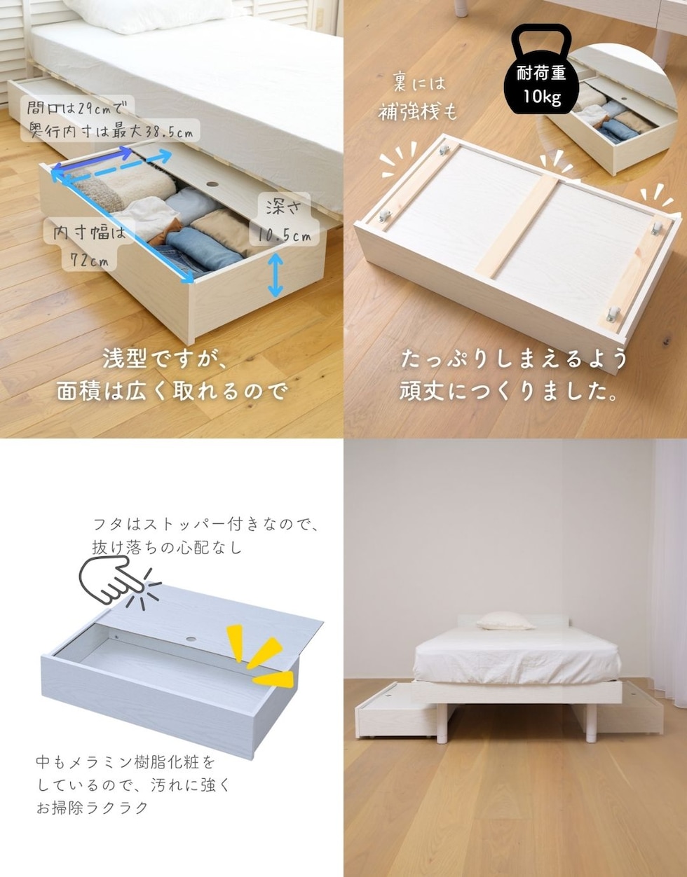 | 商品説明 | ●ベッドフレームは2梱包で重たい荷姿で玄関先までのお届けとなります。搬入、組み立て、設置はお二人以上での作業がおすすめです。 ●プラスドライバーをご用意ください。六角レンチは付属あり。 ●薄型の棚付きヘッドボードのシングルベッド ●棚には2口コンセントが付いていて、枕元でスマホの充電が可能 ●棚は手前がこぼれ止めになっているので、壁に立てかければスタンドとしても活躍 ●棚内寸: 幅97 奥行8cm (中央に11×2cmのコンセントあり) ●こぼれ止め立ち上がり: 2cm ●2口コンセント、合計1500Wまで、コード長さ1.7m ●コンセントは棚のほぼ中央に配置 ●ホコリガードのフタ付きコンセント ●床面の高さは3段階で変更可能: 11/31/35cm ●ローベッドから、収納に使える高さまで、脚をネジって付け替え可能 ●ベッド下サイズ: 高さ0/19.5/23.5 幅79cm ●脚部側の脚~脚内寸: 76cm ●【床面高さ31、35cm時】ロボット掃除機も入ってベッド下の掃除もしやすい、床下貫通設計 ●【床面高さ31、35cm時】ベッド下には衣装ケースも置いて収納スペースとしても活躍 ●床面は厚み15mmのある積層材すのこを、補強フレームで支える、きしみも少ない頑丈設計 ●静止耐荷重: 200kg ※本製品は最大荷重試験の7000N(約700Kg)をクリアした商品です。当社では安全を考慮し、本商品はシングルベッド利用時は耐荷重200Kgに設定しております。耐荷重は保証値ではございません。 ●床面サイズ: 幅97 長さ195cm ●すのこ隙間: 約6cm ●フレームやヘッドボードには、湿気や傷に強い、メラミン樹脂化粧の素材を使用 ●脚部裏に貼り付けるフェルトシール付属 |
