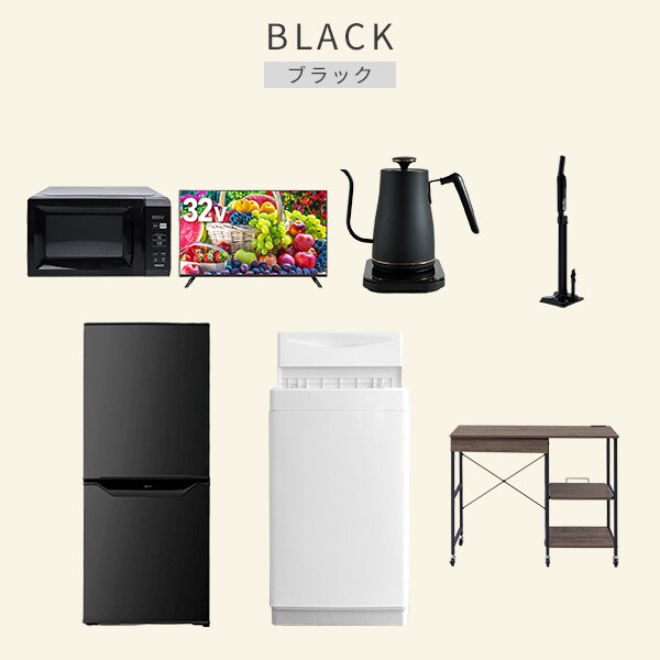 | 商品説明 | 【洗濯機】 ●容量:6.0kg(洗濯時)、1.5kg(風乾燥時) ●8つのコース搭載(標準・毛布・おいそぎ・ドライ・ソフト・つけおき・部屋干し・槽洗浄) 【冷蔵庫】 ●容量:106L(冷蔵室73L/冷凍室33L) ●年間消費電力量:268kWh/年(50Hz/60Hz) 【電子レンジ】 ●容量17L、ターンテーブル ●高周波出力:50Hz(500W、200W相当)、60Hz(650W、500W、200W相当) 【32型液晶テレビ】 ●サイズ:32V型 ●2K対応ハイビジョン液晶テレビ 【電気温調ケトル】 ●容量:800ml ●温度設定範囲:60-100度の間で1度単位で温度調整可能 【軽量クリーナー】 ●わずか820gの軽量クリーナー ●連続使用時間:(強)約10分、(標準)約25分 【レンジラック】 ●ゴミ箱上を活用する、しっかり頑丈なキッチンラック ●2口コンセント付き(計1500Wまで)でよく使う家電や雑貨をすっきりひとまとめ ●ラック以外メーカー保証:1年間 |