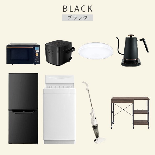 | 商品説明 | 【洗濯機】 ●容量:6.0kg(洗濯時)、1.5kg(風乾燥時) ●8つのコース搭載(標準・毛布・おいそぎ・ドライ・ソフト・つけおき・部屋干し・槽洗浄) 【冷蔵庫】 ●容量:106L(冷蔵室73L/冷凍室33L) ●年間消費電力量:268kWh/年(50Hz/60Hz) 【オーブンレンジ】 ●容量18L、フラットテーブル ●高周波出力:650W(60Hzのみ)/500W/200W相当 【炊飯器】 ●炊飯容量:3.0合炊き ●8種の炊き分けメニュー:省エネ、白米、早炊き、玄米、無洗米、炊込み、おかゆ、温度調理 【シーリングライト】 ●全光束:3600lm ●30分、60分OFFタイマー付き 【電気温調ケトル】 ●容量:800ml ●温度設定範囲:60-100度の間で1度単位で温度調整可能 【クリーナー】 ●スティック&ハンディの2WAY ●吸込仕事率:40W 【レンジラック】 ●ゴミ箱上を活用する、しっかり頑丈なキッチンラック ●2口コンセント付き(計1500Wまで)でよく使う家電や雑貨をすっきりひとまとめ ●ラック以外メーカー保証:1年間 |