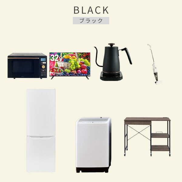 | 商品説明 | 【洗濯機】 ●容量:8.0kg(洗濯時)、1.5kg(風乾燥時) ●8つのコース搭載(標準・毛布・おいそぎ・ドライ・ソフト・つけおき・部屋干し・槽洗浄) 【冷蔵庫】 ●容量:173L(冷蔵室121L/冷凍室52L) ●年間消費電力量:250kWh/年(50Hz/60Hz) 【オーブンレンジ】 ●容量18L、フラットテーブル ●高周波出力:650W(60Hzのみ)/500W/200W相当 【32型液晶テレビ】 ●サイズ:32V型 ●2K対応ハイビジョン液晶テレビ 【電気温調ケトル】 ●容量:800ml ●温度設定範囲:60-100度の間で1度単位で温度調整可能 【クリーナー】 ●スティック&ハンディの2WAY ●吸込仕事率:40W 【レンジラック】 ●ゴミ箱上を活用する、しっかり頑丈なキッチンラック ●2口コンセント付き(計1500Wまで)でよく使う家電や雑貨をすっきりひとまとめ ●ラック以外メーカー保証:1年間 |