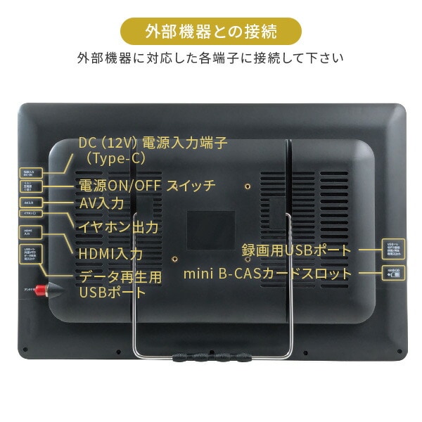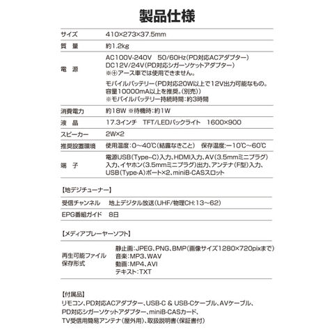 | 商品説明 | ●パソコンのサブモニターとしても使用できる!※別売HDMIコードにて接続 ●ワンセグフルセグ自動切換 ●番組表搭載 ・電源:AC100V-240V 50/60HZ (PD対応ACアダプター) 出力DC12V/24V (PD対応シガーソケットアダプター) ※+アース車では使用できません モバイルバッテリー (PD対応20W以上で12V出力可能なもの) 容量10000mAh以上を推奨(別売) ※約3時間稼働 ・消費電力:約18W※待機時:約1W ・液晶ディスプレイ:17.3インチTFT/LEDバックライト/1600*900 ・スピーカー:2W+2W ・推奨使用環境:使用温度0~40℃(※結露なきこと) 保存温度:-10℃~60℃ ・端子:電源入力・HDMI入力・AV入力・イヤホン出力・アンテナ入力・USBポート×2・mini B-CASスロット ・DVD/CDプレーヤー※DVDプレーヤー内蔵モデルのみ 対応フォーマット:DVDビデオ、DVD-R/RW(CPRM/VR対応)、音楽CD、CD-R/RW ・地デジチューナー 受信チャンネル:地上デジタル放送(UHF/物理CH:13~62) EPG番組ガイド:8日 ・メディアプレーヤーソフト 再生可能ファイル保存形式:静止画 JPEG、PNG、BMP(画像サイズ1280×720pixまで) 音楽:MP3、WAV 動画:MP4、AVI テキスト:TXT ・対応ファイル形式は、すべてのファイルの再生を保証するものではありません ・付属品:リモコン、リモコン用電池、PD対応用ACアダプター、PD対応シガーソケットアダプター、USB-C&USB-Cケーブル、AVケーブル、TV受信用簡易アンテナ(屋外用)、mini B-CASカード、取扱説明書 ※TV受信用簡易アンテナを使用したテレビ視聴について: 本製品付属のアンテナは、屋外用の簡易的なアンテナです。 テレビの電波塔から遠い場所、コンクリートの壁を使用した建物の中では受信ができない場合があります。 ※※テレビを快適に受信するには: ・窓際や屋外など受信感度が良い場所でご使用ください。 ・別売のアンテナケーブル(F型同軸ケーブル)に繋いだ上でご使用ください。 |