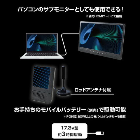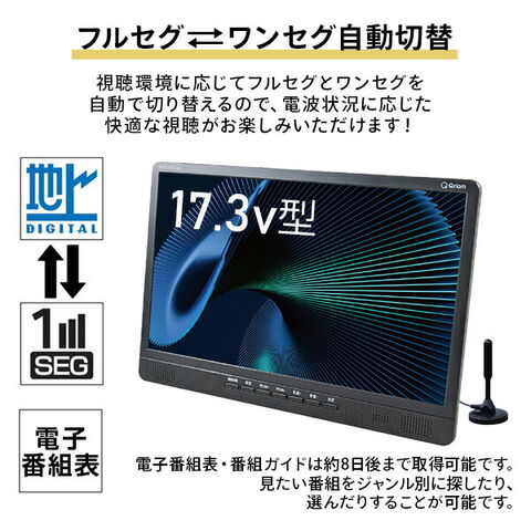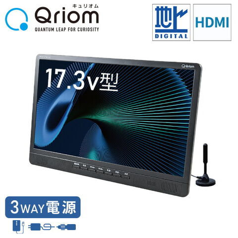 ポータブルテレビ 地上デジタル放送対応 17.3インチ 電源3WAY AC DC モバイルバッテリー mini B-CASカード付属 PTV-173C サブモニター 在宅 山善 YAMAZEN キュリオム Qriom 【送料無料】