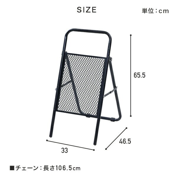 | 本体サイズ | バリケード(1枚):幅33×奥行46.5×高さ65.5cm 重量2kg チェーン:長さ106.5cm |