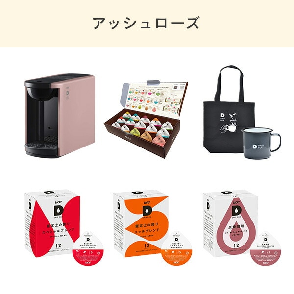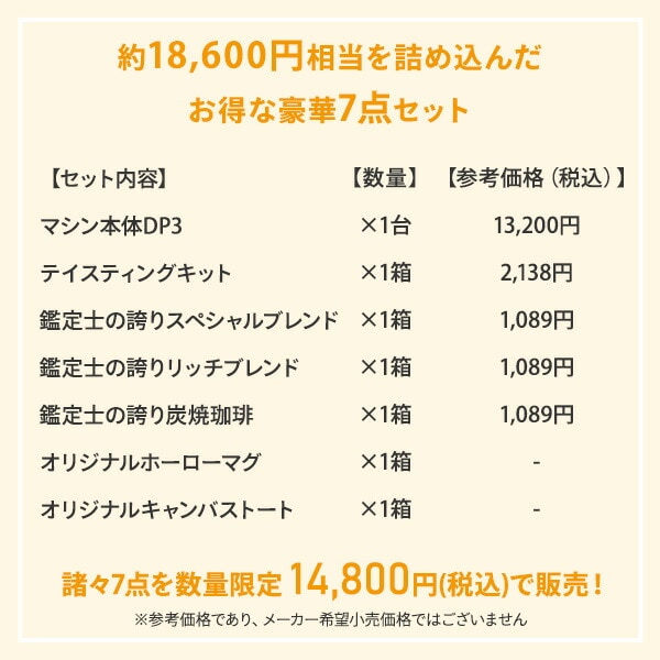 ●セット内容:マシン本体、15種飲み比べカプセルボックス×1箱、鑑定士の誇り スペシャルブレンド×1箱、鑑定士の誇り リッチブレンド×1箱、鑑定士の誇り 炭焼珈琲×1箱、オリジナルホーローマグ、オリジナルキャンバストート