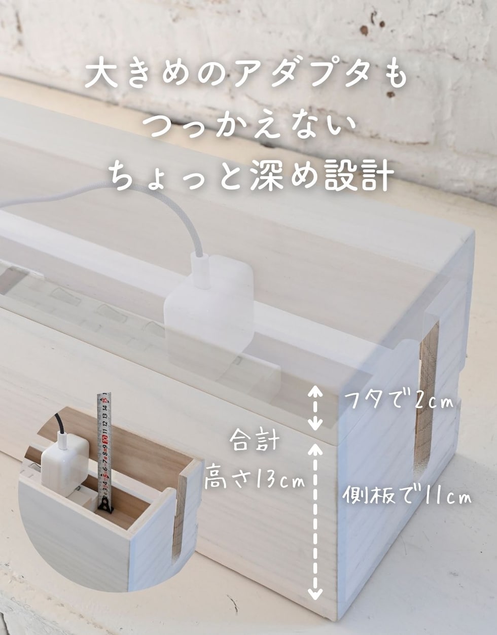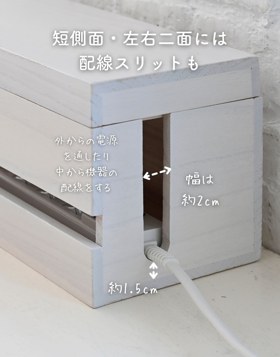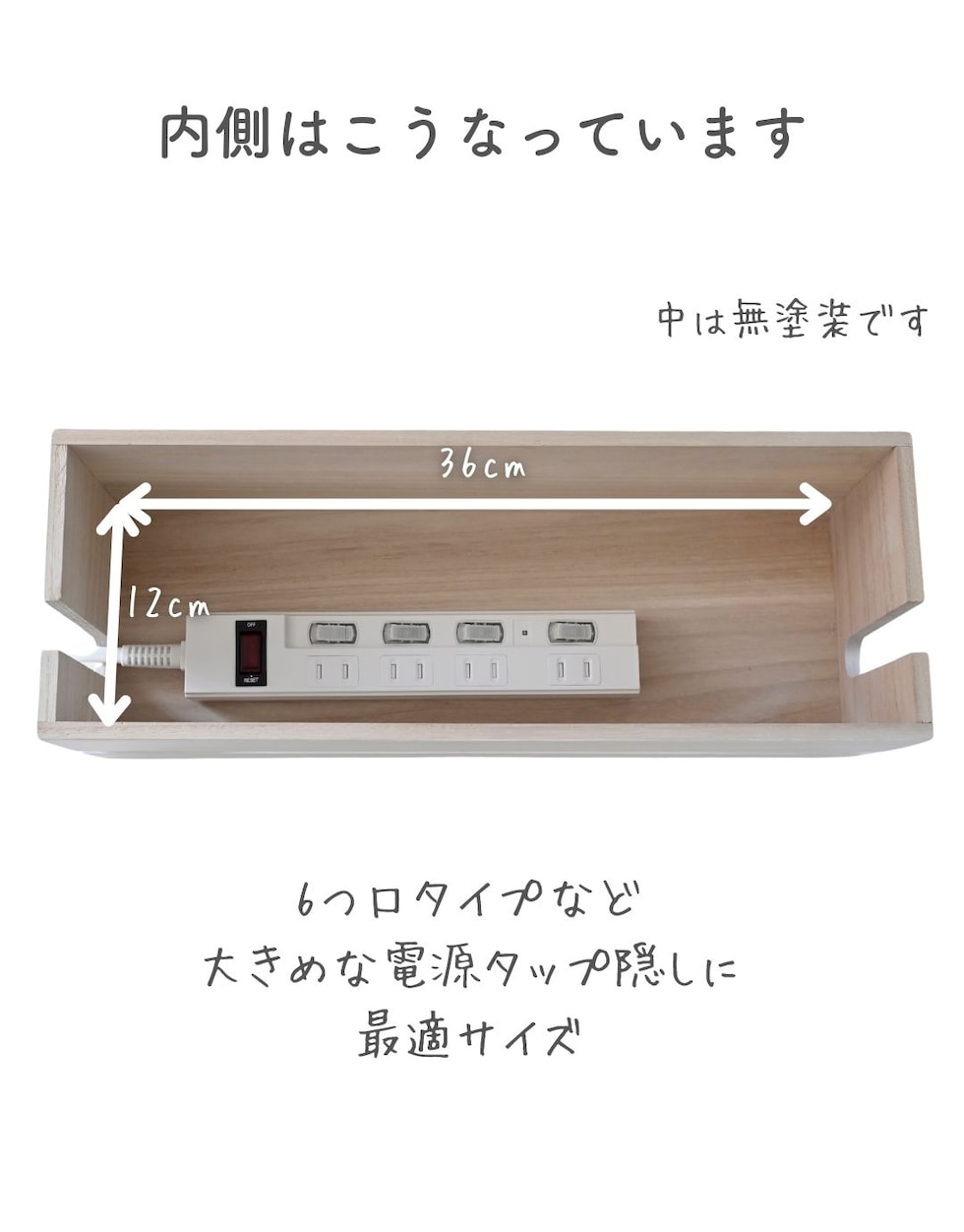 | 商品説明 | ●完成品でお届け ※手作りのため、研磨の精度や細部の塗装には個体差がございますので、見本写真をご参照の上、予めご了承ください。 ●電源タップをすっきり隠せる、ケーブル収納ボックス ●木製タイプ、フタ付き ●対応目安、5口 ●大きめのアダプタもしまえる、深型設計 ●外側には、電源タップのON/OFF操作にうれしいスリット窓付き ●短側面には配線スリットがあり、コード通し可能 ●フタは着脱式 ●内寸:幅36 奥行12 深さ計13(側板11+フタ2)cm ●短側面スリット窓: 2×9cm ●塗装面は外側の5面(底面と内部は無塗装) |