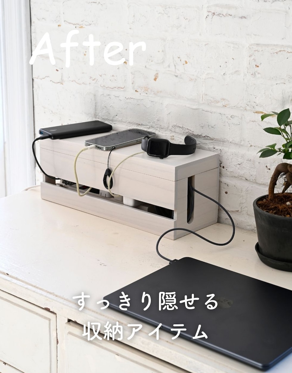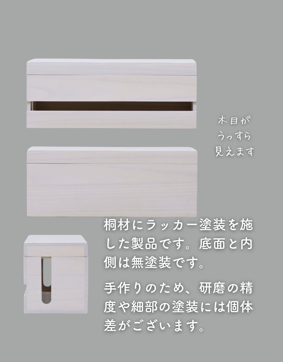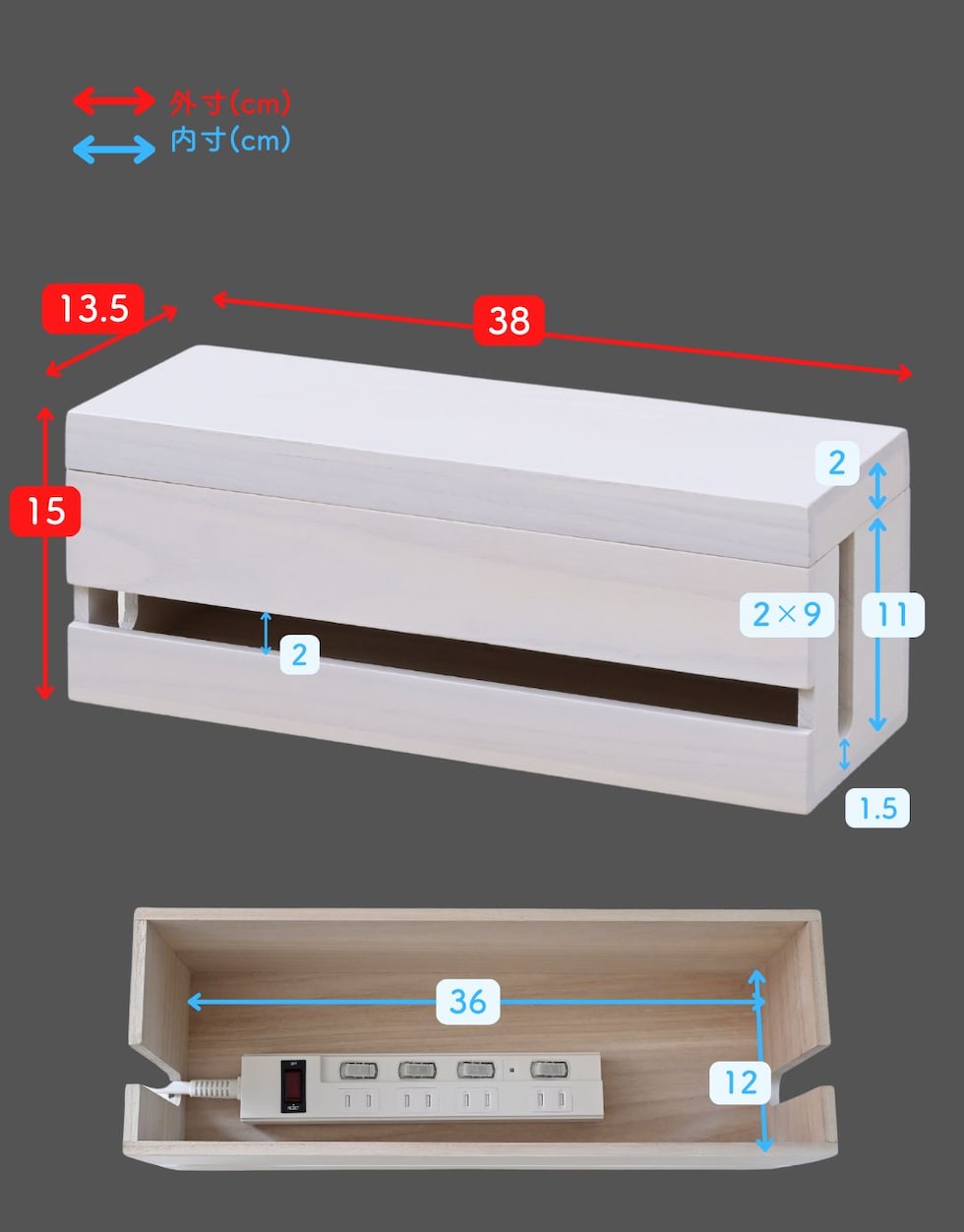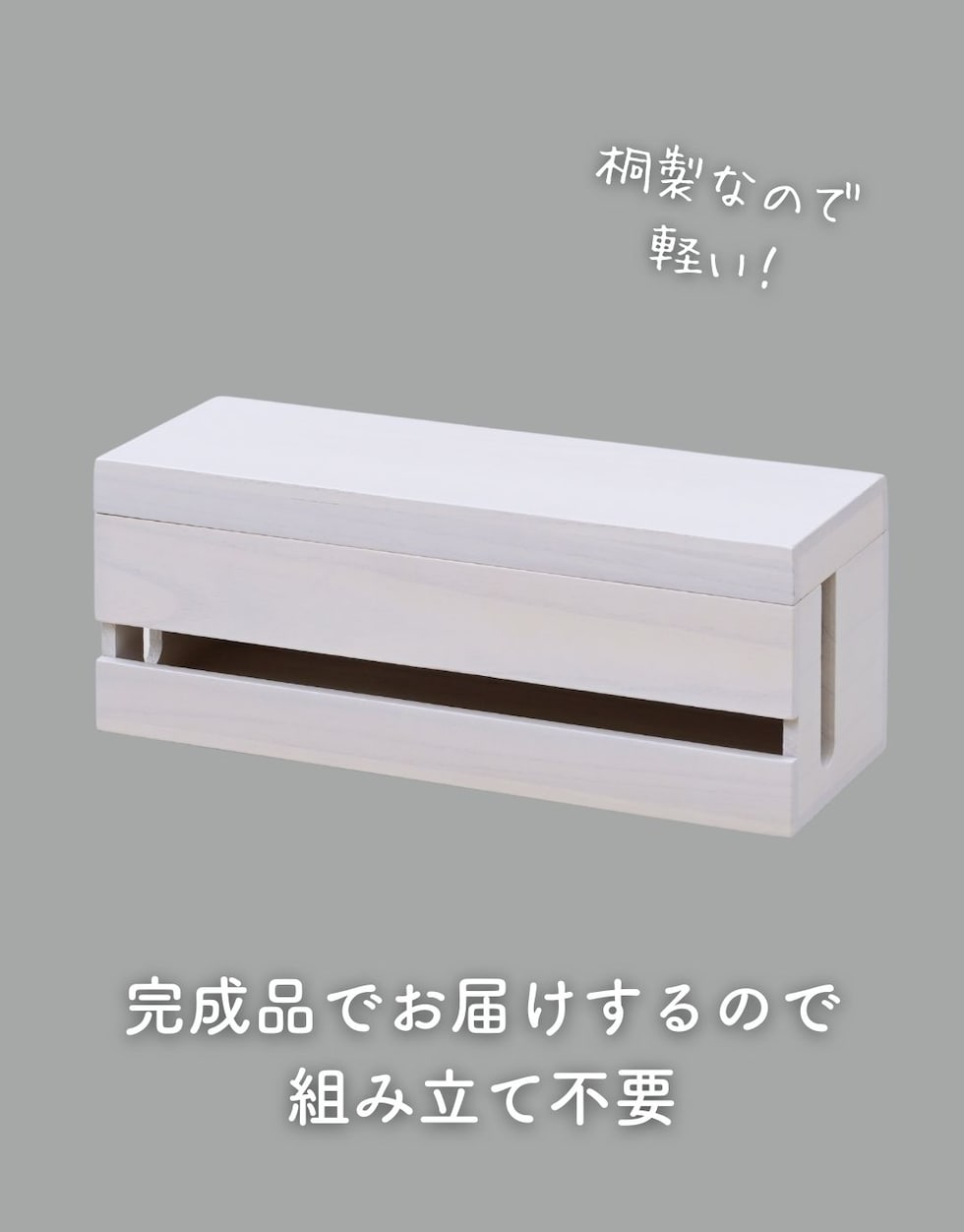 | 商品説明 | ●完成品でお届け ※手作りのため、研磨の精度や細部の塗装には個体差がございますので、見本写真をご参照の上、予めご了承ください。 ●電源タップをすっきり隠せる、ケーブル収納ボックス ●木製タイプ、フタ付き ●対応目安、5口 ●大きめのアダプタもしまえる、深型設計 ●外側には、電源タップのON/OFF操作にうれしいスリット窓付き ●短側面には配線スリットがあり、コード通し可能 ●フタは着脱式 ●内寸:幅36 奥行12 深さ計13(側板11+フタ2)cm ●短側面スリット窓: 2×9cm ●塗装面は外側の5面(底面と内部は無塗装) |