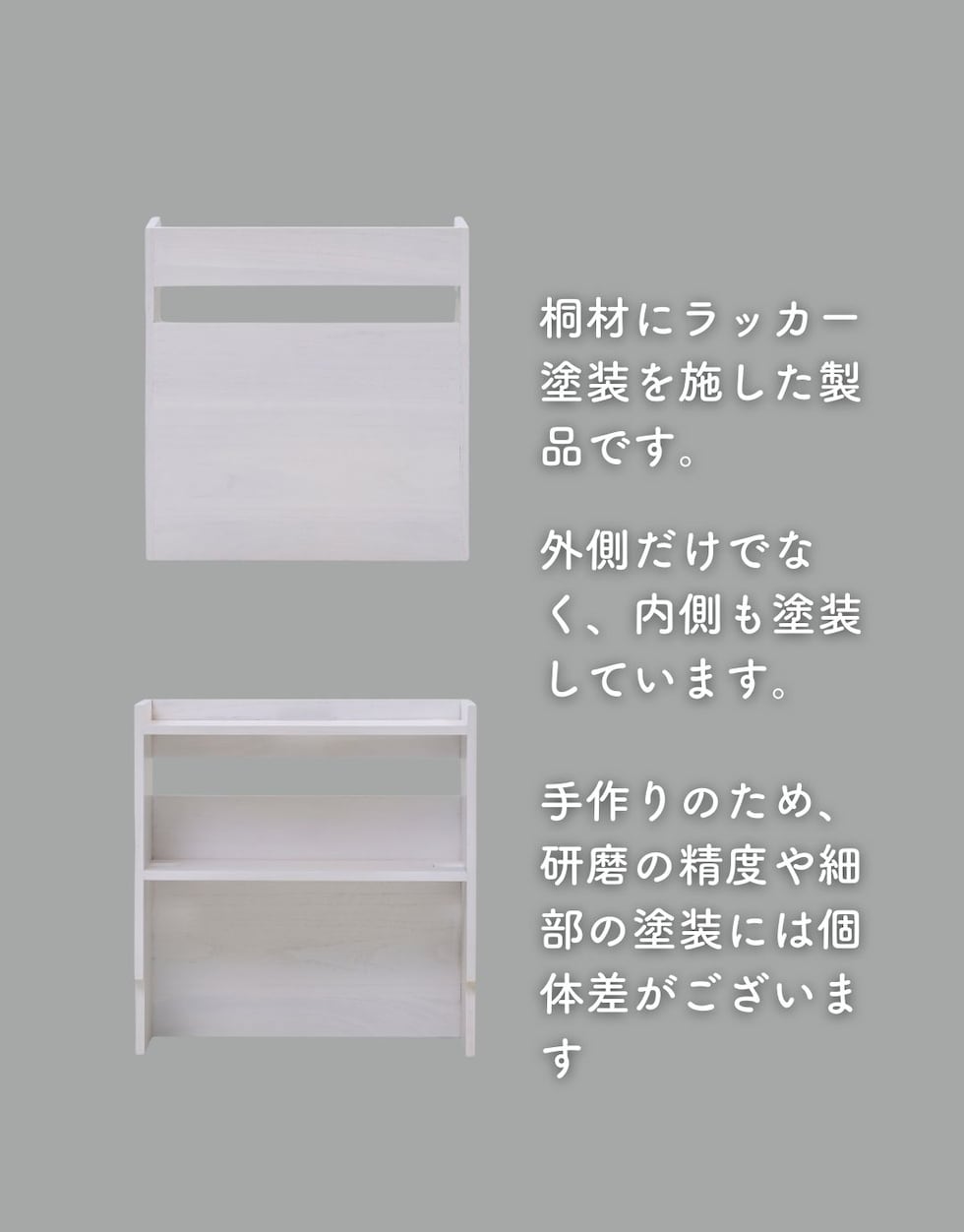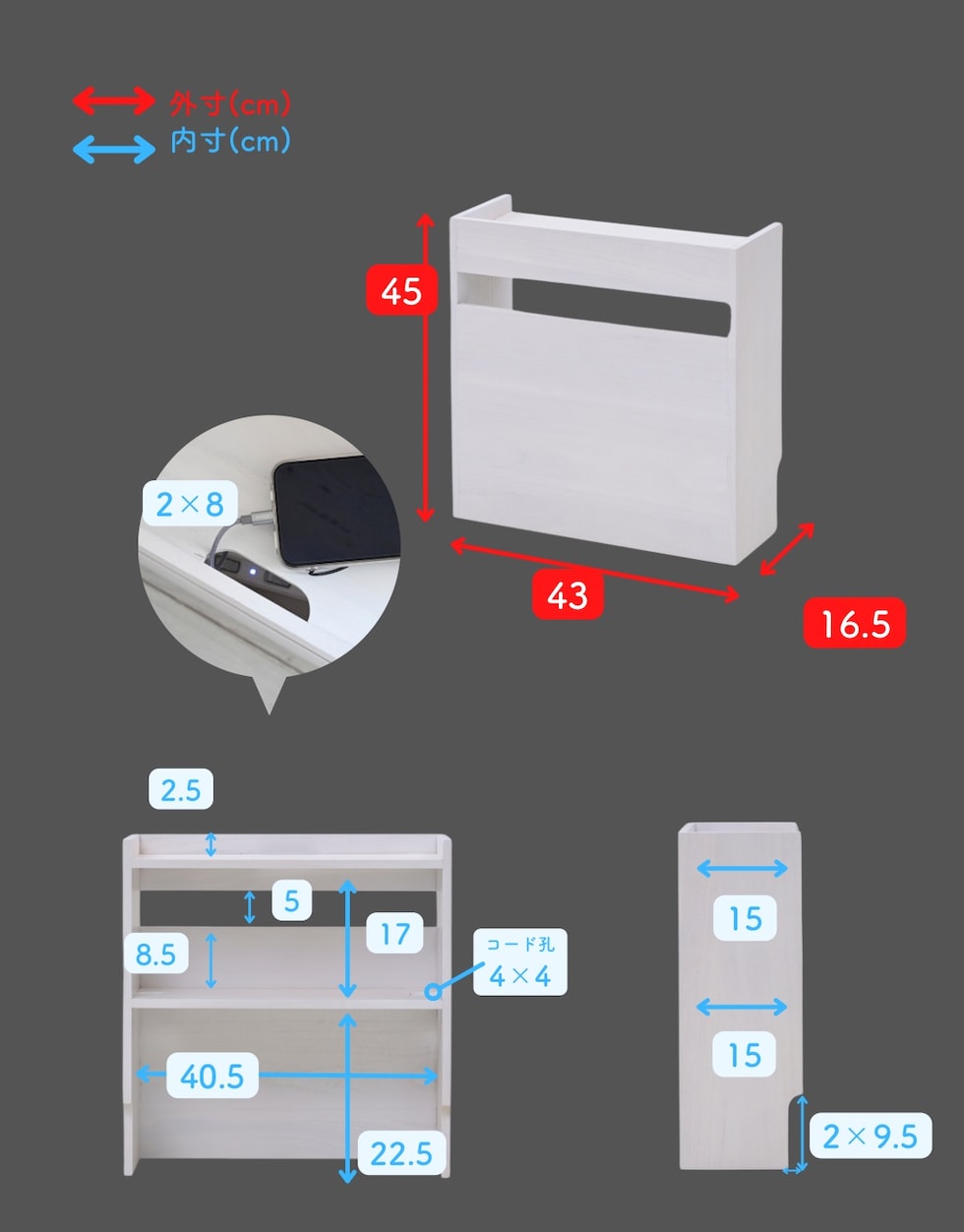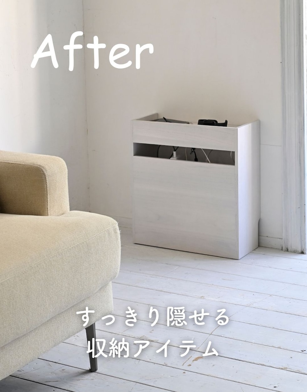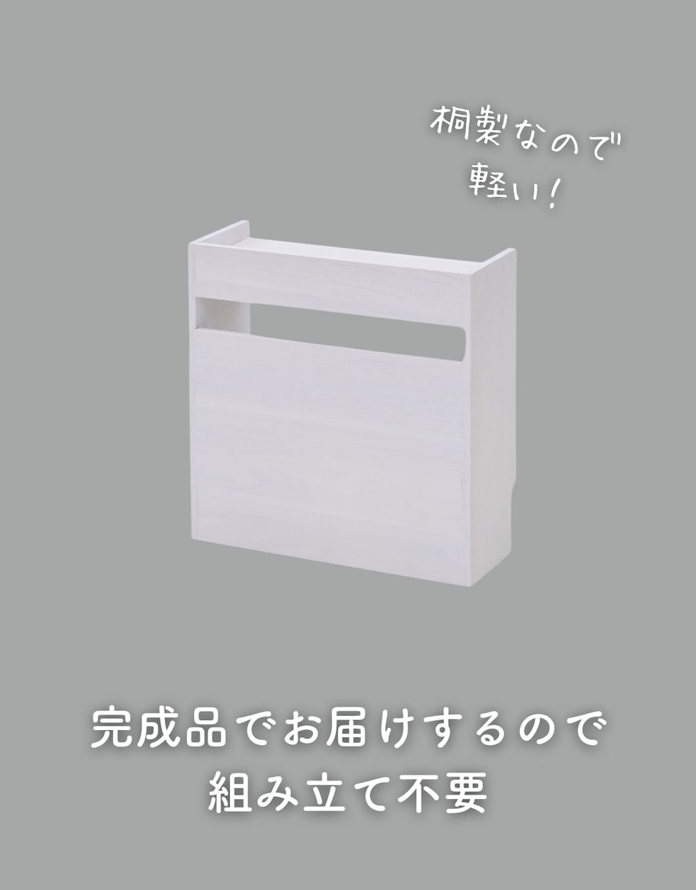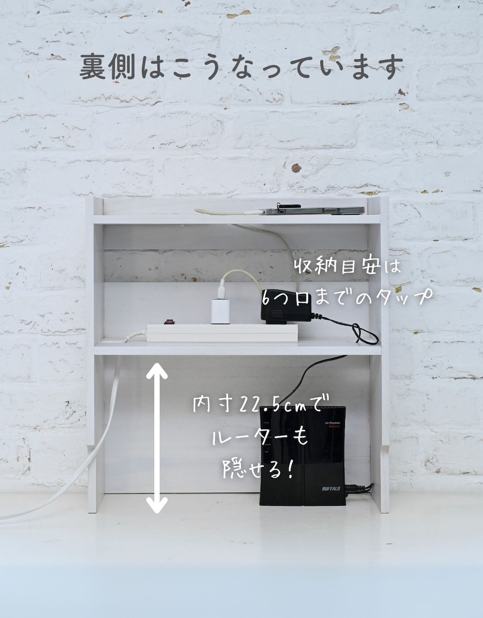 | 商品説明 | ●完成品でお届け ※手作りのため、研磨の精度や細部の塗装には個体差がございますので、見本写真をご参照の上、予めご了承ください。 ●タップやルーターをすっきり隠せる、ケーブル収納ボックス ●内側が放熱しやすいオープン仕様 ●巾木カットされているので、壁に付けてすっきり隠す収納 ●内側には固定棚が1段あり、電源タップを収納可能 ●外側には、電源タップのON/OFF操作にうれしいスリット窓付き ●中棚両端にも配線孔があり、内部でコード通し可能 ●スリット入りの天板で、ケーブルを出して充電可能 ●天板は固定式 ●天板内寸:幅40.5 奥行15 こぼれ止め高さ2.5cm ●中棚内寸:幅40.5 奥行15 高さ17cm ●中棚下内寸:幅40.5 奥行15 高さ22.5cm ●スリット窓:よこ40.5 たて5cm、中棚からの高さ8.5cm ●天板スリット: 約2×8cm ●中棚コード孔: 約4×4cm ●内側も塗装あり(底面は無塗装) ●巾木カット: 約2×9.5cm |
