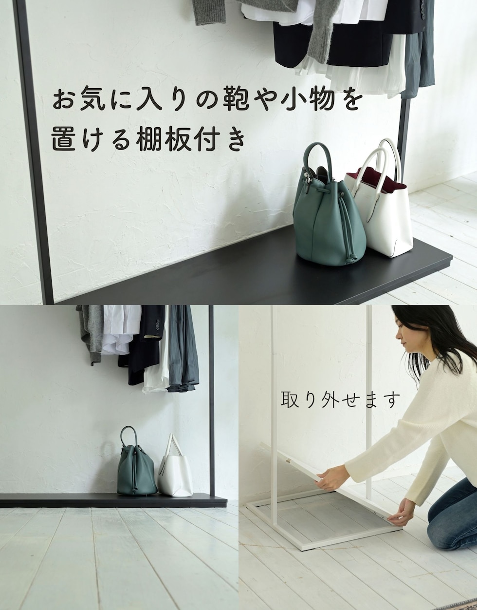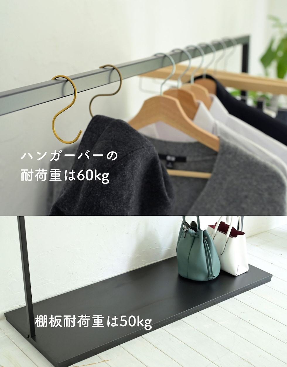 | 商品説明 | ●様々なテイストのお部屋に溶け込むシンプルなハンガーラック ●フレームはツヤのないマットな質感 ●毎日使う洋服もクローゼットに入りきらない洋服も見せる収納に ●靴やお気に入りの小物も置ける下棚付き ●耐荷重: ハンガーバー60kg 棚板50kg 全体110kg ●内寸: 幅115.5cm ハンガーバーから棚板まで144.5cm ●床から棚板上までの高さ: 4cm |