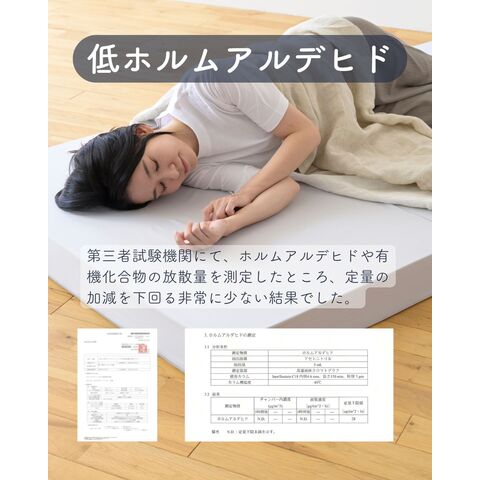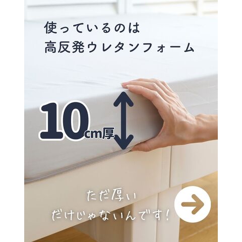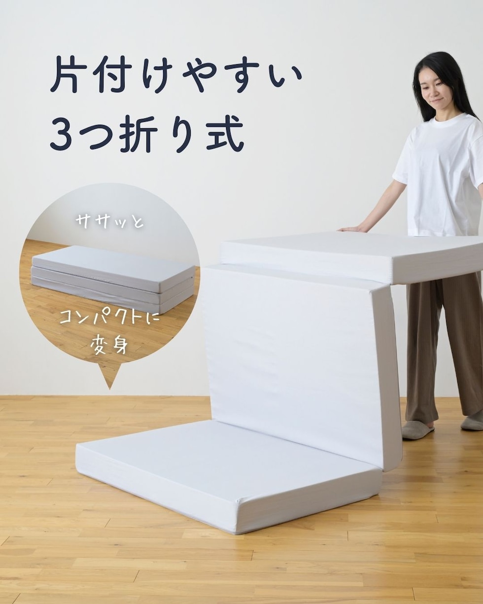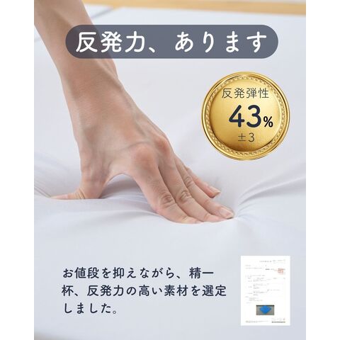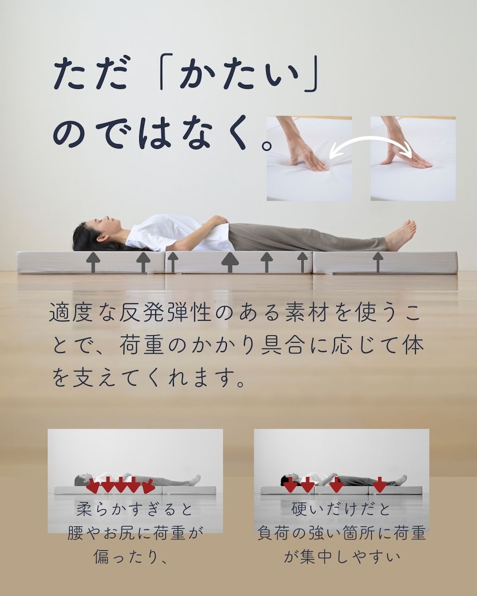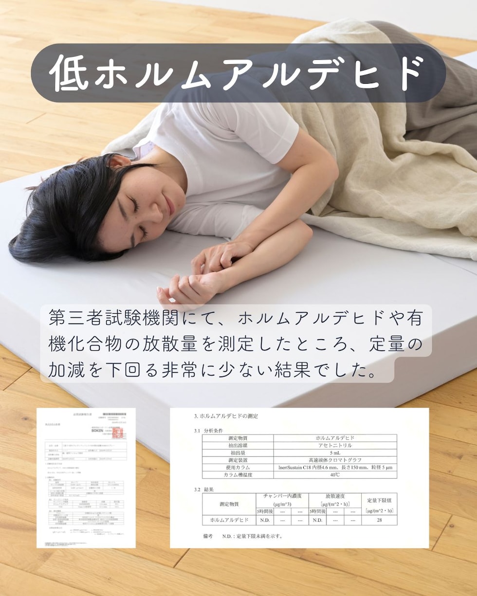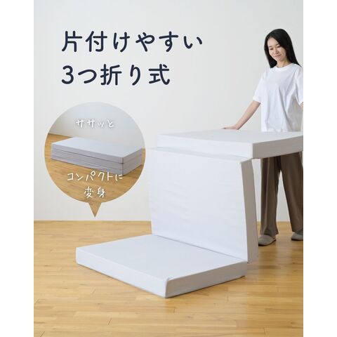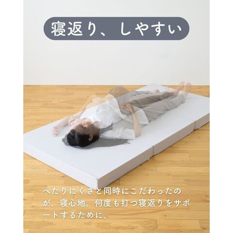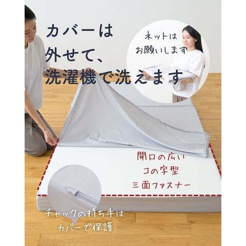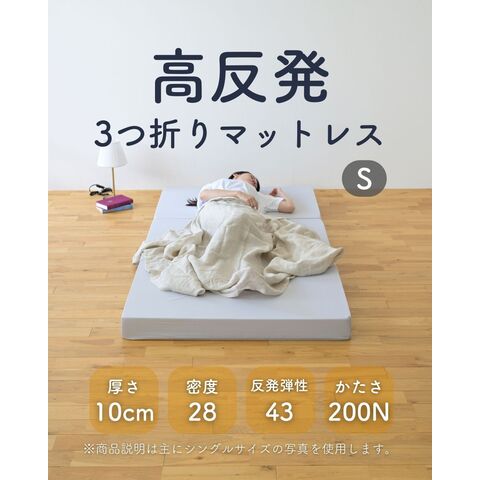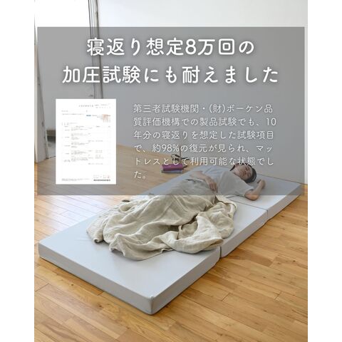 | 商品説明 | ●圧縮梱包で玄関先まで小さくお届けできるマットレス ※開封後約1日で復元しますが、環境により時間が前後します ●開梱にはハサミが必要 ●ボリュームのある厚み10cmのウレタンマットレス ●3つ折り式で、コンパクトに収納可能 ●縦向きに自立もできる厚みなので、干すときもラクラク ●JIS基準に準拠する試験を合格した安心仕様 ●寝返りをサポートする、高反発フォームを使用(反発弾性43) ●かたさ200N(ニュートン):【参考】スタッフ所感は、体重40kgの人で沈まずかために感じ、体重80kgの人で沈み込むものの底付きはしない感じです。 ●底付きしにくい密度(28D)で、連続8万回の圧縮試験を経ても復元率は98% ●側地はいざというときに洗濯機で洗濯可能(要ネット使用、内袋はなし) ●三面ファスナーで出し入れ可能 ●床にキズが入らないように、ファスナーの持ち手はカバーで保護 |