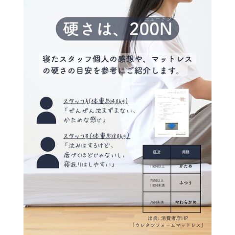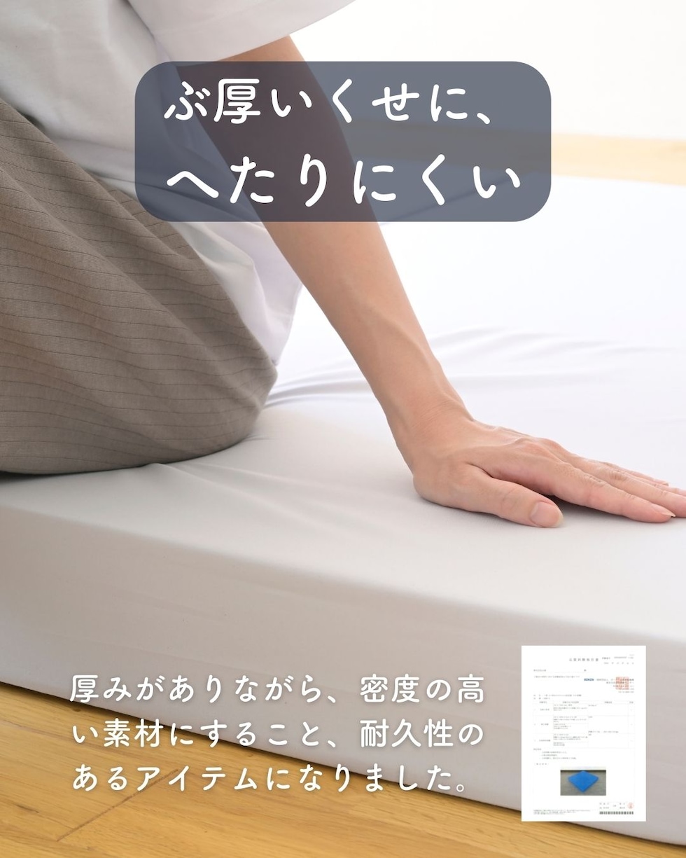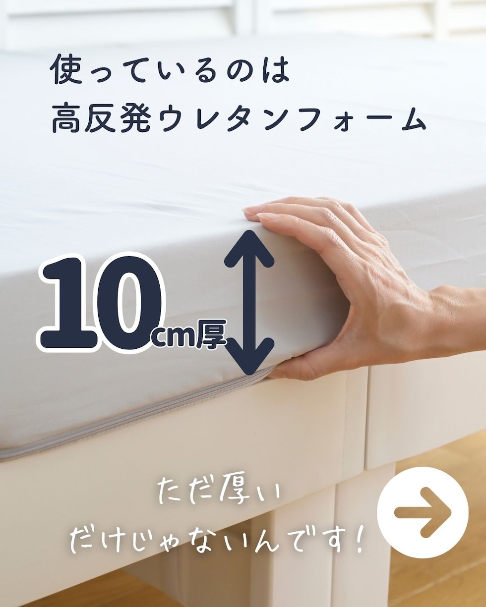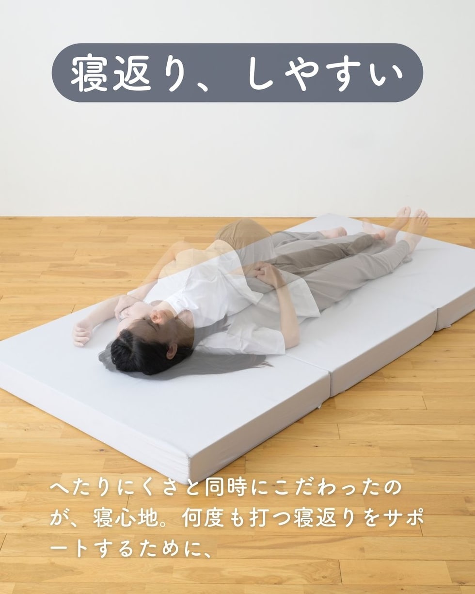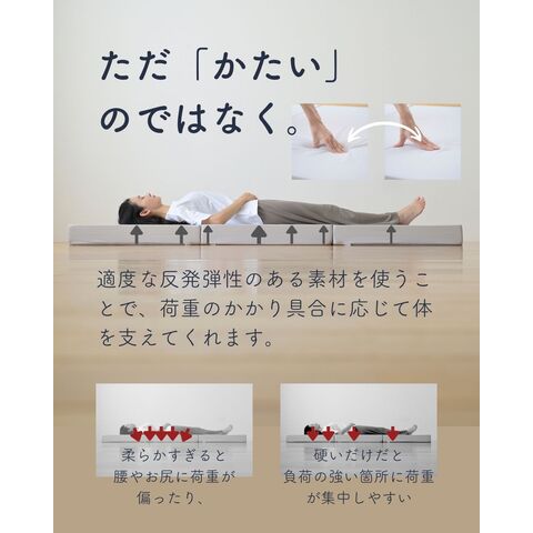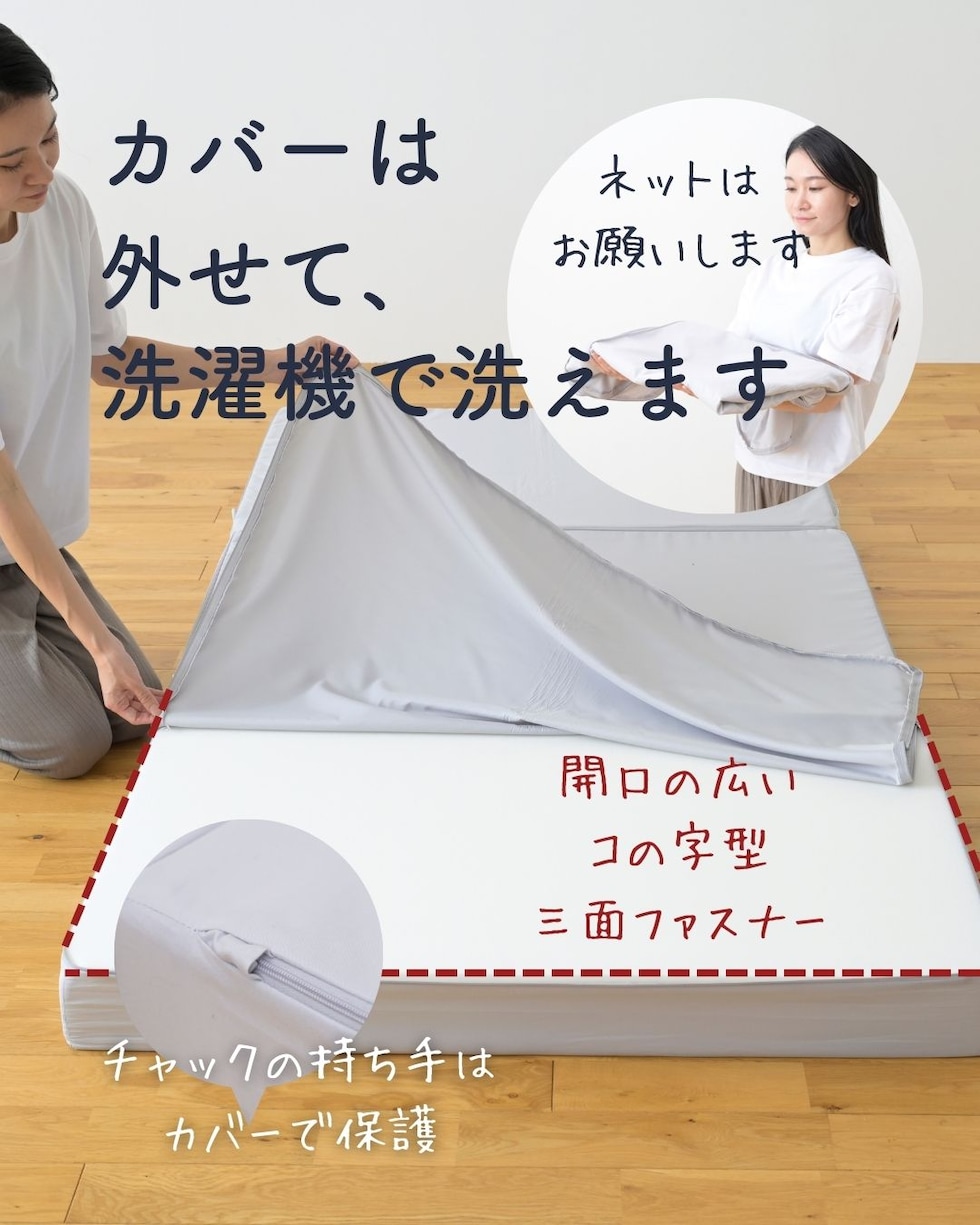 | 商品説明 | ●圧縮梱包で玄関先まで小さくお届けできるマットレス ※開封後約1日で復元しますが、環境により時間が前後します ●開梱にはハサミが必要 ●ボリュームのある厚み10cmのウレタンマットレス ●3つ折り式で、コンパクトに収納可能 ●縦向きに自立もできる厚みなので、干すときもラクラク ●JIS基準に準拠する試験を合格した安心仕様 ●寝返りをサポートする、高反発フォームを使用(反発弾性43) ●かたさ200N(ニュートン):【参考】スタッフ所感は、体重40kgの人で沈まずかために感じ、体重80kgの人で沈み込むものの底付きはしない感じです。 ●底付きしにくい密度(28D)で、連続8万回の圧縮試験を経ても復元率は98% ●側地はいざというときに洗濯機で洗濯可能(要ネット使用、内袋はなし) ●三面ファスナーで出し入れ可能 ●床にキズが入らないように、ファスナーの持ち手はカバーで保護 |