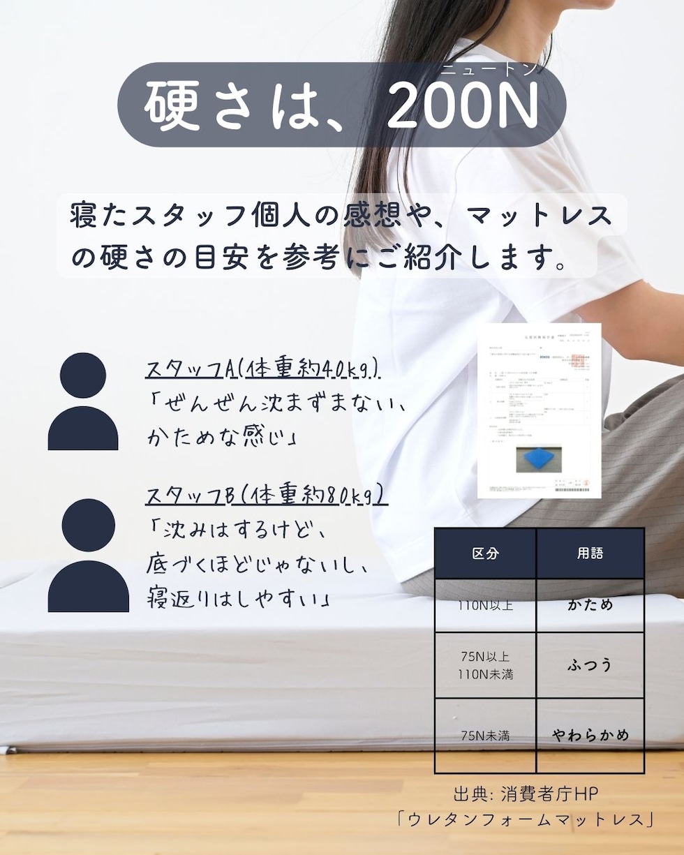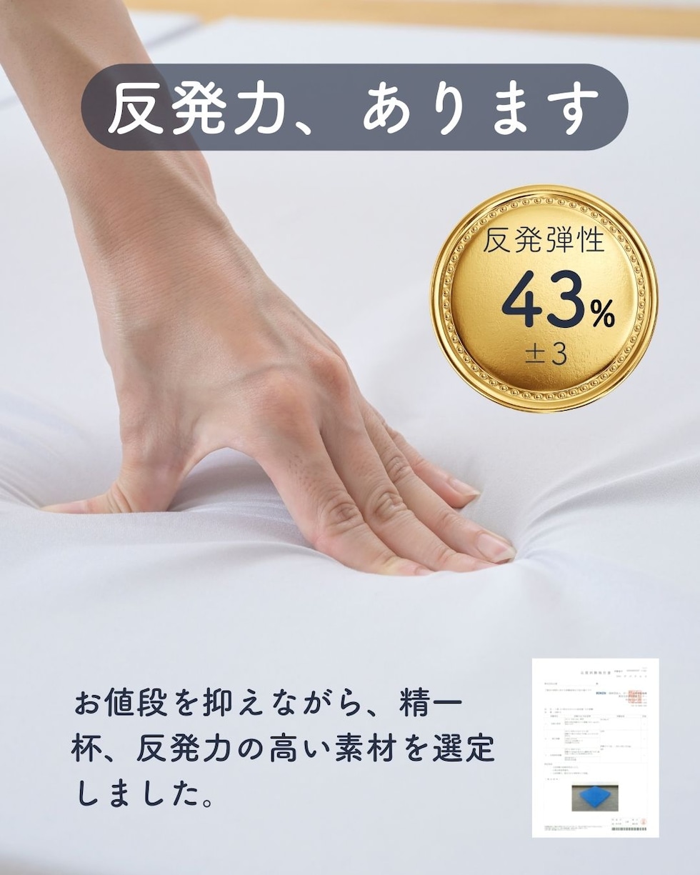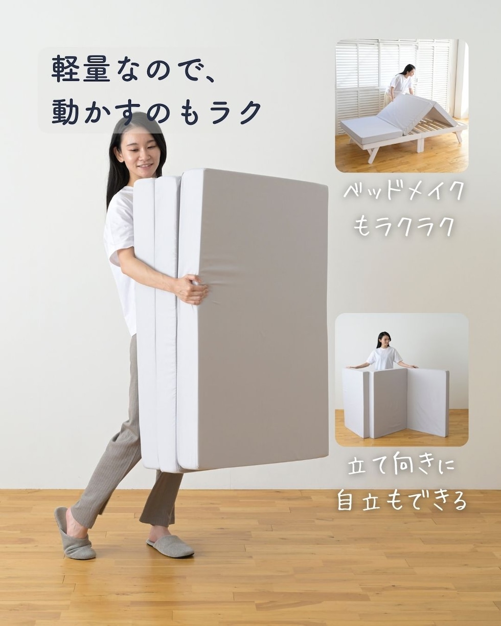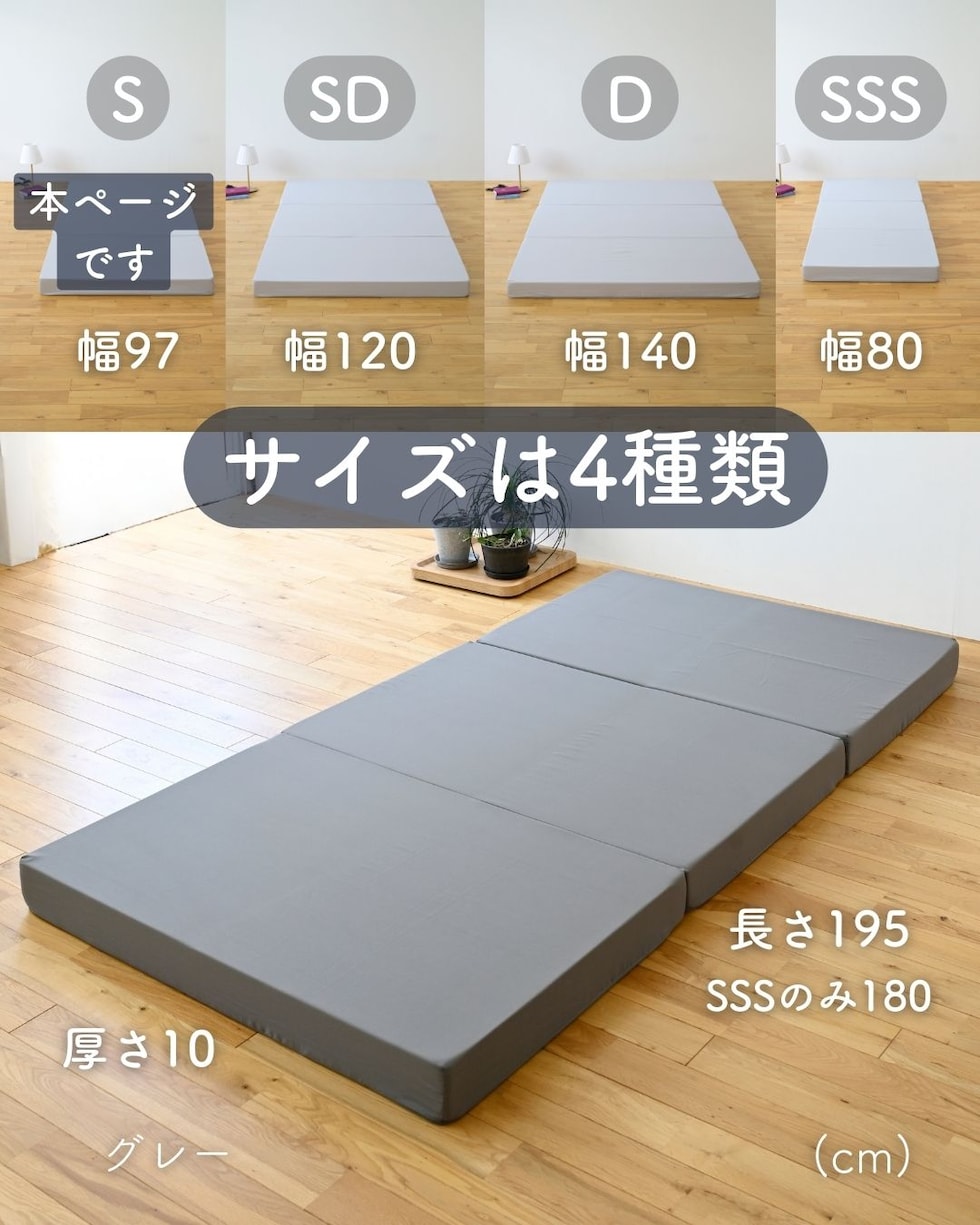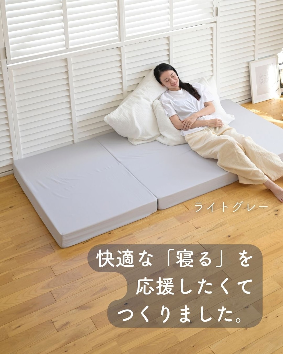 | 商品説明 | ●圧縮梱包で玄関先まで小さくお届けできるマットレス ※開封後約1日で復元しますが、環境により時間が前後します ●開梱にはハサミが必要 ●ボリュームのある厚み10cmのウレタンマットレス ●3つ折り式で、コンパクトに収納可能 ●縦向きに自立もできる厚みなので、干すときもラクラク ●JIS基準に準拠する試験を合格した安心仕様 ●寝返りをサポートする、高反発フォームを使用(反発弾性43) ●かたさ200N(ニュートン):【参考】スタッフ所感は、体重40kgの人で沈まずかために感じ、体重80kgの人で沈み込むものの底付きはしない感じです。 ●底付きしにくい密度(28D)で、連続8万回の圧縮試験を経ても復元率は98% ●側地はいざというときに洗濯機で洗濯可能(要ネット使用、内袋はなし) ●三面ファスナーで出し入れ可能 ●床にキズが入らないように、ファスナーの持ち手はカバーで保護 |