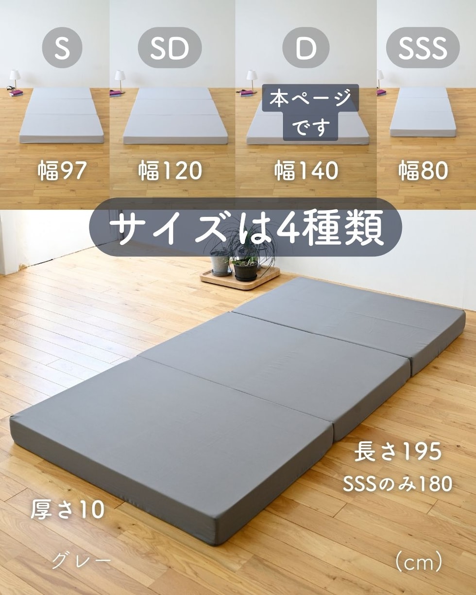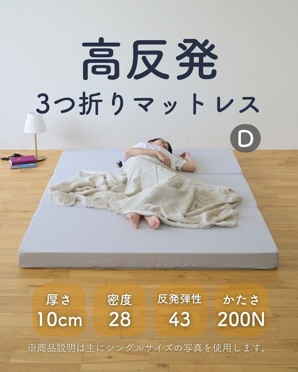 | 商品説明 | ●圧縮梱包で玄関先まで小さくお届けできるマットレス ※開封後約1日で復元しますが、環境により時間が前後します ●開梱にはハサミが必要 ●ボリュームのある厚み10cmのウレタンマットレス ●3つ折り式で、コンパクトに収納可能 ●縦向きに自立もできる厚みなので、干すときもラクラク ●JIS基準に準拠する試験を合格した安心仕様 ●寝返りをサポートする、高反発フォームを使用(反発弾性43) ●かたさ200N(ニュートン):【参考】スタッフ所感は、体重40kgの人で沈まずかために感じ、体重80kgの人で沈み込むものの底付きはしない感じです。 ●底付きしにくい密度(28D)で、連続8万回の圧縮試験を経ても復元率は98% ●側地はいざというときに洗濯機で洗濯可能(要ネット使用、内袋はなし) ●三面ファスナーで出し入れ可能 ●床にキズが入らないように、ファスナーの持ち手はカバーで保護 |