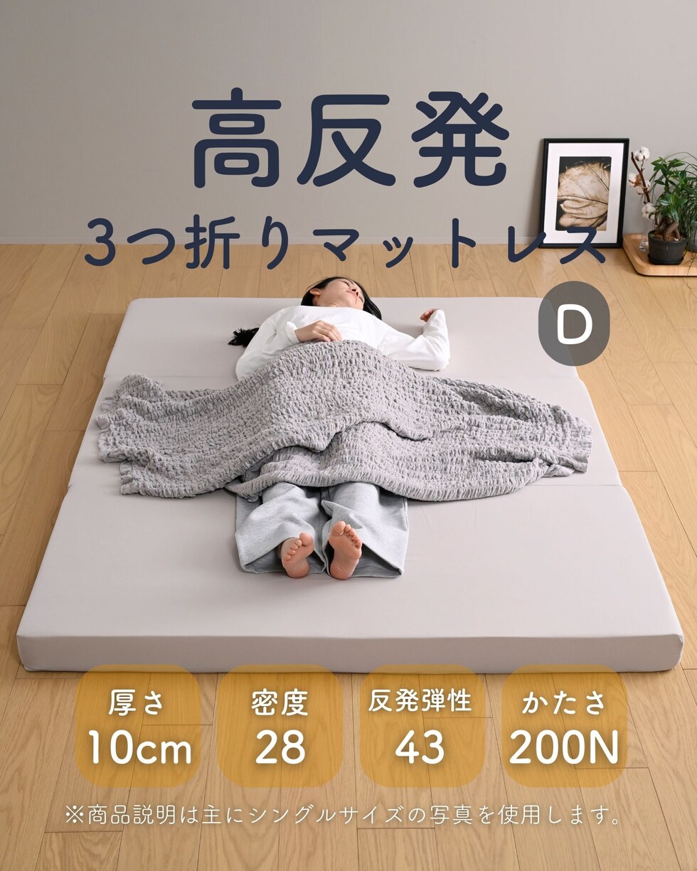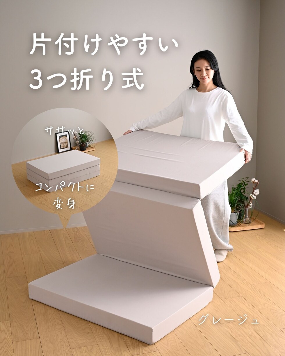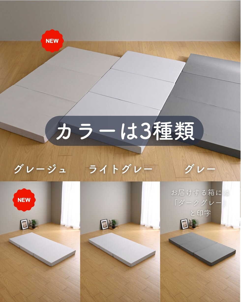| 商品説明 | ●圧縮梱包で玄関先まで小さくお届けできるマットレス ※開封後約2-3日で復元しますが、環境により時間が前後します ●開梱にはハサミが必要 ●ボリュームのある厚み10cmのウレタンマットレス ●3つ折り式で、コンパクトに収納可能 ●縦向きに自立もできる厚みなので、干すときもラクラク ●JIS基準に準拠する試験を合格した安心仕様 ●寝返りをサポートする、高反発フォームを使用(反発弾性43) ●かたさ200N(ニュートン):【参考】スタッフ所感は、体重40kgの人で沈まずかために感じ、体重80kgの人で沈み込むものの底付きはしない感じです。 ●底付きしにくい密度(28D)で、連続8万回の圧縮試験を経ても復元率は98% ●側地はいざというときに洗濯機で洗濯可能(要ネット使用、内袋はなし) ●三面ファスナーで出し入れ可能 ●床にキズが入らないように、ファスナーの持ち手はカバーで保護 ●買い物かごの表記と、商品の箱に記載される表示のみ、違いがございます。紛らわしく恐れ入りますが、予めご了承ください。 ・グレー→【箱】ダークグレー |