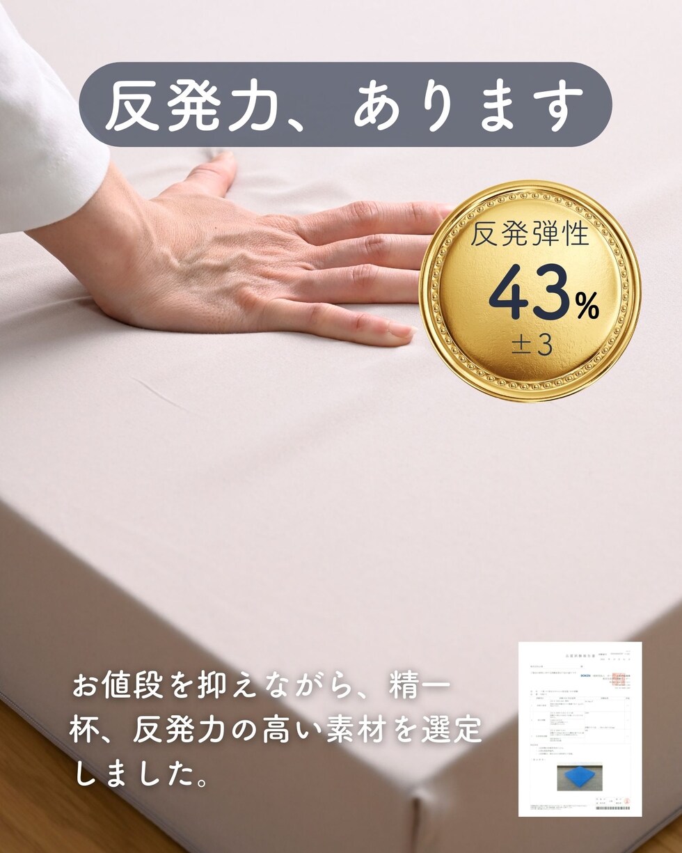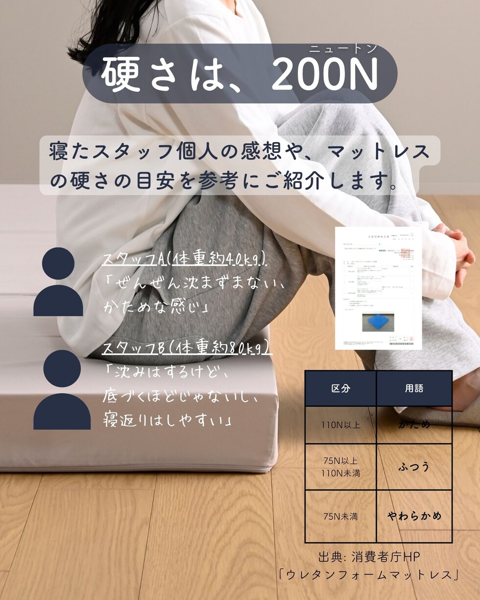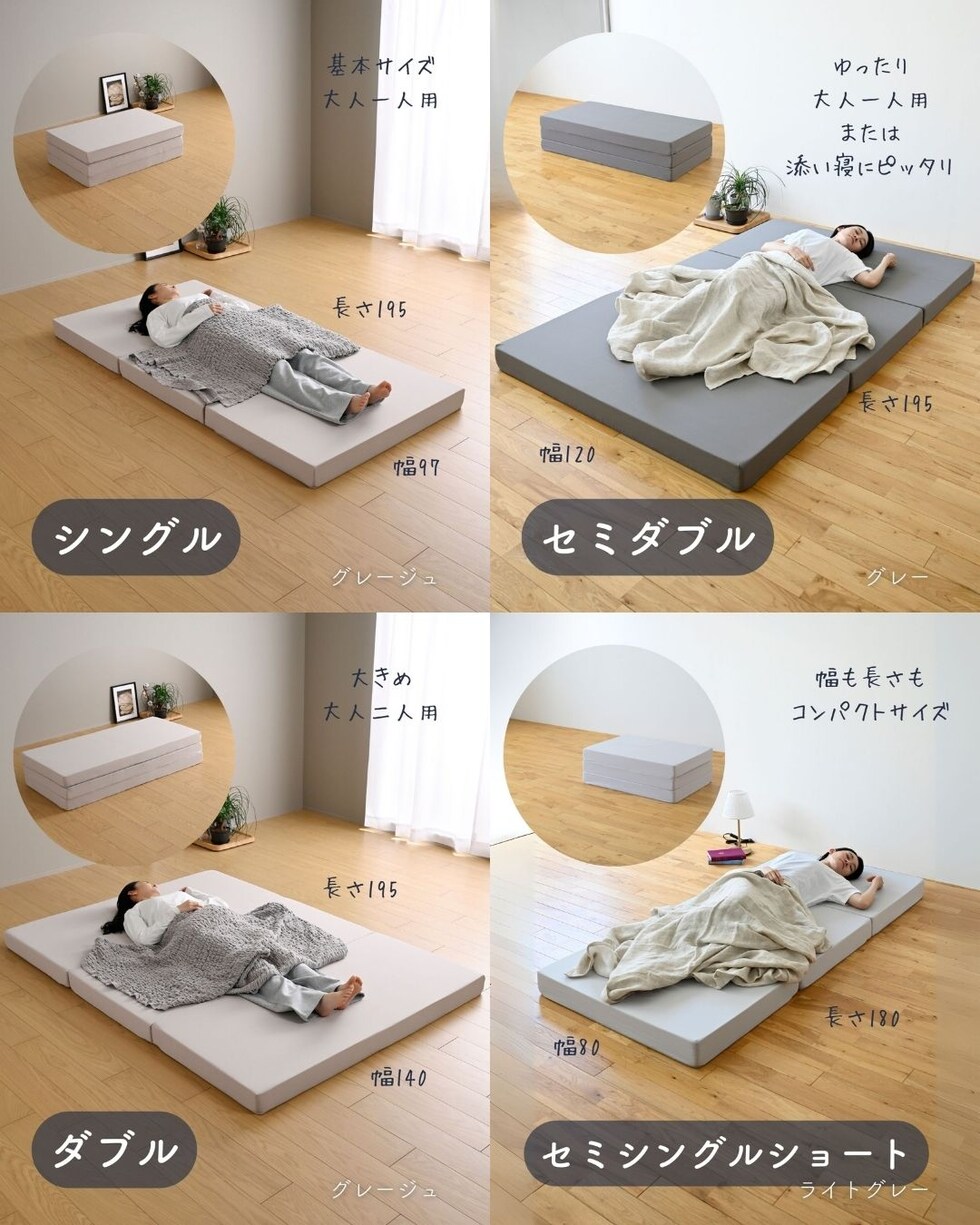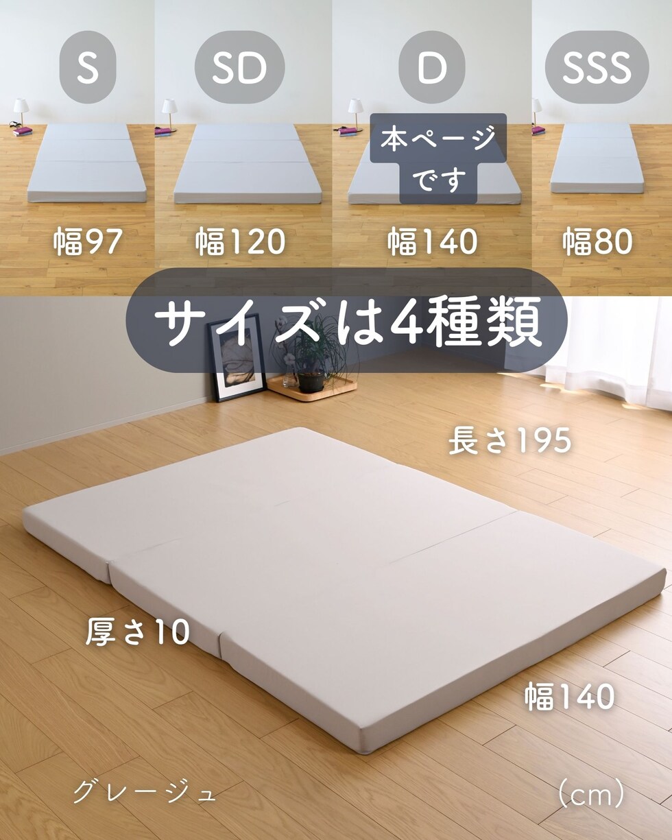 | 商品説明 | ●圧縮梱包で玄関先まで小さくお届けできるマットレス ※開封後約2-3日で復元しますが、環境により時間が前後します ●開梱にはハサミが必要 ●ボリュームのある厚み10cmのウレタンマットレス ●3つ折り式で、コンパクトに収納可能 ●縦向きに自立もできる厚みなので、干すときもラクラク ●JIS基準に準拠する試験を合格した安心仕様 ●寝返りをサポートする、高反発フォームを使用(反発弾性43) ●かたさ200N(ニュートン):【参考】スタッフ所感は、体重40kgの人で沈まずかために感じ、体重80kgの人で沈み込むものの底付きはしない感じです。 ●底付きしにくい密度(28D)で、連続8万回の圧縮試験を経ても復元率は98% ●側地はいざというときに洗濯機で洗濯可能(要ネット使用、内袋はなし) ●三面ファスナーで出し入れ可能 ●床にキズが入らないように、ファスナーの持ち手はカバーで保護 ●買い物かごの表記と、商品の箱に記載される表示のみ、違いがございます。紛らわしく恐れ入りますが、予めご了承ください。 ・グレー→【箱】ダークグレー |