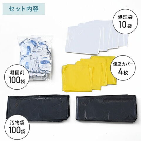 | 商品説明 | ●セット内容:凝固剤×100個、汚物袋(黒)×100枚、便座カバー(黄色)×4枚、処理袋(白)×20枚 ●災害、停電、断水、介護、渋滞に!大容量タイプ ●凝固剤はたっぷり10g入り!長期保存可能なアルミパック包装 ●水がなくても気軽にトイレができる! ●消臭、抗菌 ※消臭効果はアンモニア臭に対する効果です ●使用方法:便座を上げた状態で便器に便座カバーをかぶせます。便座カバーの上に汚物袋をかぶせます。使用後、凝固剤を振りかけます。汚物袋だけを取り出し、口を結びます。汚物袋を処理袋に入れて各自治体の指示に従って廃棄してください ●トイレがない場合でもバケツ等を利用して簡易トイレとして対応可能 ●保存期間:製造から約10年 ※本製品は高温多湿な場所を避けて保管ください ※保管状況により保存期間は異なってきます ※表示の期限は目安になります |