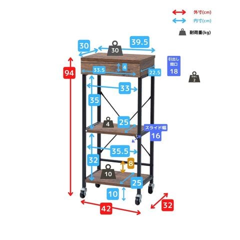 | 商品説明 | ●プラスドライバーをご用意ください(六角レンチは付属あり) ●幅も奥行もコンパクトなキッチンラック ●カトラリーなど小物を入れる浅引出しと、スライド棚付き ●スイスイ動くキャスター付き (ストッパー2個あり) ●天板高さが約94cmあって、作業の補助台としても便利 ●背面も化粧仕上げなので、リビングに出しても見た目すっきり ●引き出しは樹脂製で組み立て不要、中のお掃除もラクラク ●天板サイズ: 幅39.5 奥行30cm ●引き出し内寸: 幅33.5(底面34.5) 奥行22.5 深さ4(天板まで5)cm、間口19.5cm ●引き出しストッパー付き(両端に約1cmのネジ式ストッパー) ●スライド棚内寸:幅33 奥行25 高さ35、スライド幅16cm ●下棚内寸: 幅35.5 奥行25 高さ32cm ●下棚からこぼれ止めまでの高さ8cm ●棚下隙間: 幅33 高さ10cm |