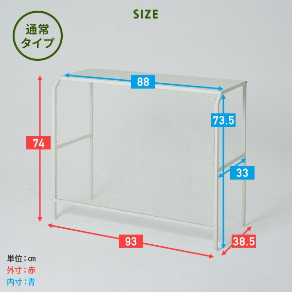 | 本体サイズ | 幅93×奥行38.5×高さ74cm 重量7kg 室外機収納部内寸:幅88×奥行33 高さ73.5cm |