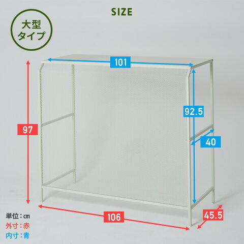 | 本体サイズ | 幅106×奥行45.5×高さ97cm 重量9.7kg 室外機収納部内寸:幅101×奥行40×高さ92.5cm |