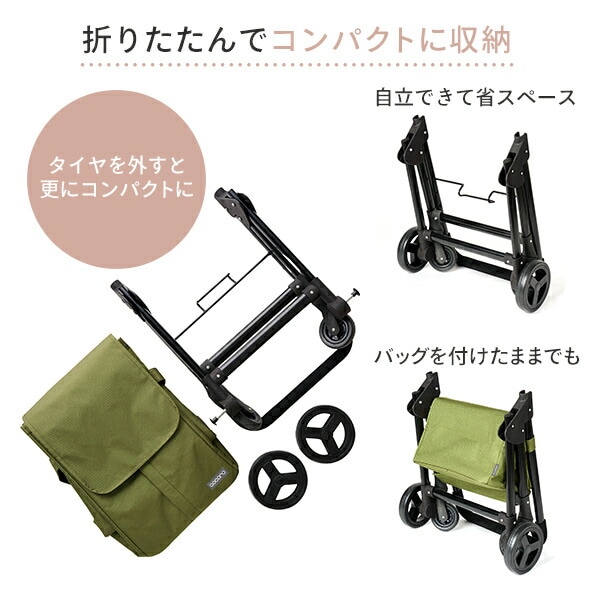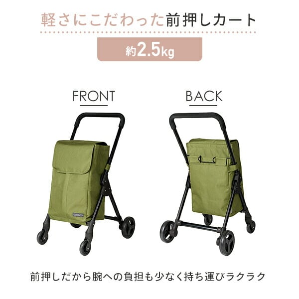 | 商品説明 | ●容量:約35L ●耐荷重:10kg ●カジュアルに使いこなせるスマートな外観の前押しカート ●どんなファッションにも合うベーシックな色展開(ネイビー/カーキ/ブラック) ●前面に大きなファスナーがついており物の出し入れが簡単 ●バッグ裏地はアルミ蒸着フィルムのため保冷保温対応 ●カートはタイヤを外してコンパクトに折りたたみ可能(後輪のみ) ●折りたたんで自立ができバッグを付けたままでもコンパクトに収納可能 ●スーパーのカートに掛けられるフック付き ※スーパーのカートの形状によっては掛けられない場合もございます ※この製品は歩行を補助するための歩行補助車ではありません |