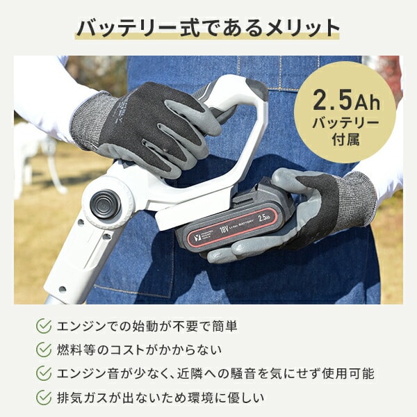 | 商品説明 | ●【本体】 ●電圧:直流18V ●回転数:約280/分 ●無負荷回転時間:約60分 ●作業幅:約200mm ●耕運深さ:約80mm ●ハンドル部は角度調整機能付き ●伸縮式で持ち運びや収納もラクラク ●付属品:ループハンドルセット、2.5Ahバッテリー、充電器、回転刃×2、六角ネジセット×2、六角棒レンチ×1 ●【バッテリー(YBP-1825)】 ●電圧:直流18V ●容量:2.5Ah ●充電時間:約60分(専用充電器 YCH-18V使用時) 【充電器(YCH-18V)】 ●入力:AC100V ●出力:DC18V 3.0A ●周波数:50/60Hz 150VA ●お買上日より保証期間1年(バッテリーおよび充電器は、消耗品のため保証対象外となります。) |