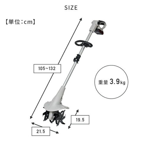 | 本体サイズ | 【本体】幅:21.5cm×奥行:105-132cm×高さ:19.5cm 重量:3.9kg 【バッテリー】幅:11.8cm×奥行:7.6cm×高さ:4.9cm 重量:380g 【充電器】幅:14.5cm×奥行:11.5cm×高さ:7.4cm 重量:400g |
