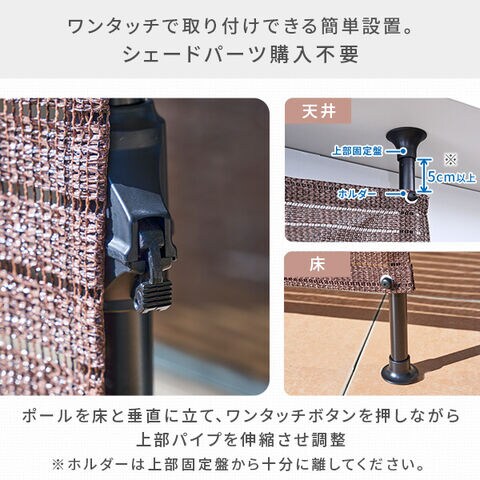 | 商品説明 | ●ワンタッチで取り付けできるカンタン設置 ●サンシェードの設置高さは220-315cmの間で自在に調整可能 ●ボーダーメッシュで通気性抜群 ●遮光率約76% ●紫外線遮蔽約85% ※組み立て設置はふたりでの作業をお勧めします。 台風など、強風や悪天候が見込まれる際は事前に取り外してください。 |