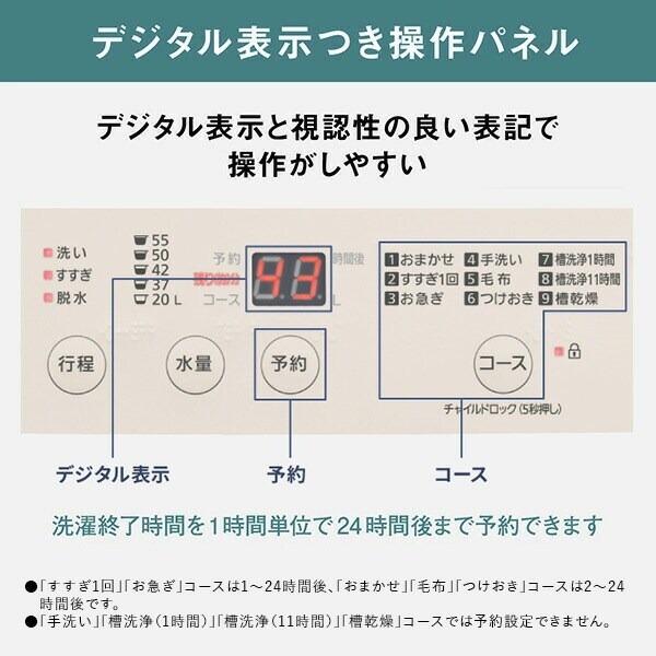 | 商品説明 | ●洗濯・脱水容量:7kg ●標準仕様水量:119L ●目安時間:約43分 ●運転音:洗濯時37dB/脱水時46dB ●コース:おまかせ/すすぎ1回/お急ぎ/手洗い/毛布/つけおき/槽洗浄(1時間)/槽洗浄(11時間)/槽乾燥 ●対応防水フロアー:奥行(内寸)54cm以上 ●付属品:給水ホース、外部排水ホース、保護カバー |