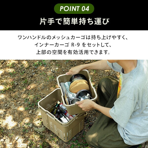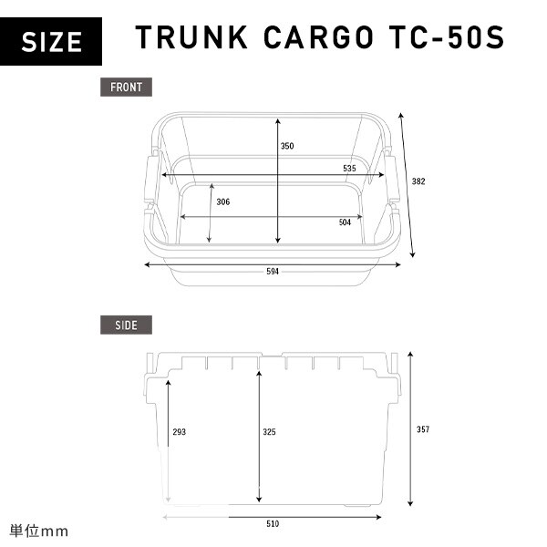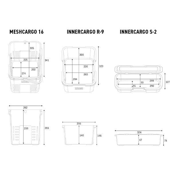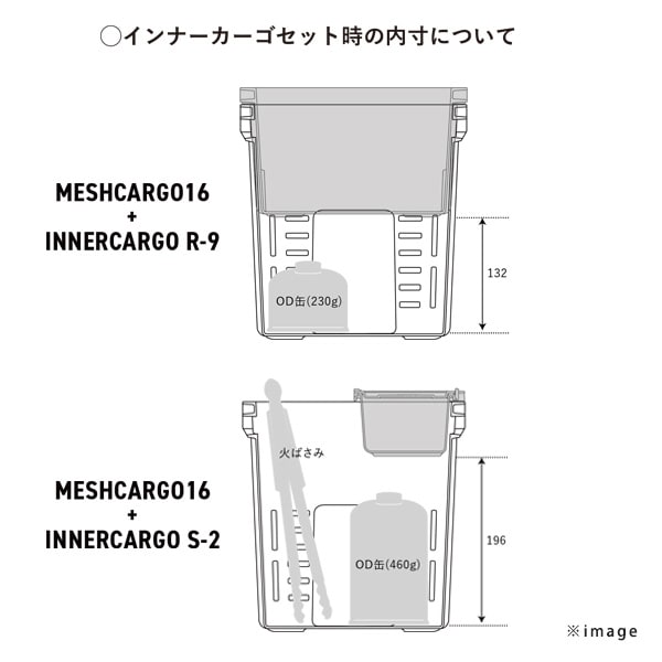 | 本体サイズ | 【トランクカーゴ TC-50S】 幅60×奥行39×高さ35.7cm 重量2.6kg 【メッシュカーゴ 16】 幅34.1×奥行26.2×高さ26.5cm 重量760g 【インナーカーゴ R-9】 幅32.3×奥行25.5×高さ14.6cm 重量470g 【メッシュカーゴ/インナーカーゴ用フタ】 幅32.4×奥行25.5×高さ1.5cm 重量201g 【インナーカーゴ S-2】 幅32.4×奥行12.7×高さ7.8cm 重量238g |