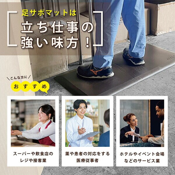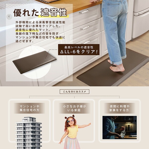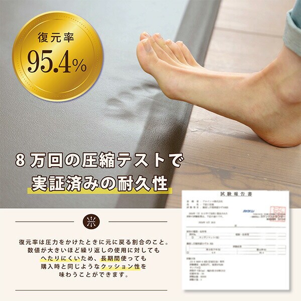 | 商品説明 | ●足の負担軽減に特化したカラダにやさしいキッチンマット ●最大圧力約30%軽減 ●8万回の圧縮テストで実証済みの耐久性 ●撥水性が高く汚れに強い ●優れた遮音性 ●全辺安心のなだらか傾斜加工 |