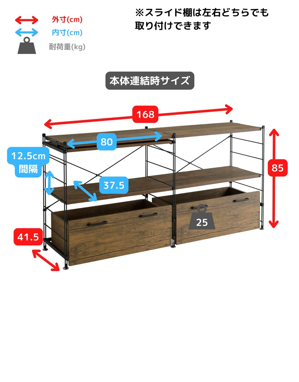 | 商品説明 | ●【取り付け時の注意事項】 ※2人以上ですと作業がしやすいです。 ※横揺れ軽減のため、付属のコの字バーを取り付けてください。 ※ストッカーのキャスターは一方向仕様です。 ※プラス、マイナスドライバーをご用意ください ※キャスターと併用はできません。 ※コの字バーは並列できません。段をずらして設置してください。 ●幅85.5cmのウッドシェルフ本体とオプションパーツを合わせたセット 【セット内容】 ウッドシェルフ本体×1 ストッカー+コの字バー×2 スライド棚×1 棚×1 クロスバー×1 支柱×1 【ウッドシェルフ本体】 ●モノに合わせて棚の位置を変えられる木製棚板のスチールラック ●インボックスなど収納ボックスが縦にすっぽり収まるサイズ設計 ●棚板は木の質感があってお手入れもかんたんな、合成樹脂化粧繊維板 ●軽くて強いフラッシュ構造で、1段あたり25kgの耐荷重 ●フックでフレームに引っ掛けるだけなので、位置の変更もかんたん 【ストッカー+コの字バー】 ●耐荷重30kgのしっかり設計 ●2Lのペットボトルが最大15本収納可能 ●カラフルなパッケージをしまえる深さで隠す収納をサポート ●正面から目立ちにくい隠しキャスター ●サイズ: 幅77×奥行き37×高さ31.5cm 重量12.5kg ●内寸:幅 70.5×奥行き32.5×深さ22.5cm 【スライド棚】 ●レール式でスムーズな開閉 ●棚板の下に付けるとちょい置きできるトレーに ●木の質感があってお手入れもかんたん ●スライド幅: 22cm ●耐荷重: 14kg ●サイズ: 幅83.5×奥行き38.5×高さ2cm 重量5kg ●内寸: 幅76.5×奥行き33.5cm 【棚】 ●サイズ: 幅83.5×奥行き38.5×高さ2cm 重量5kg ●耐荷重:1段あたり25kg 【クロスバー】 ●サイズ: 92.5 重量0.6kg 【支柱】 ●サイズ: 幅2×奥行き40×高さ85cm 重量2kg |