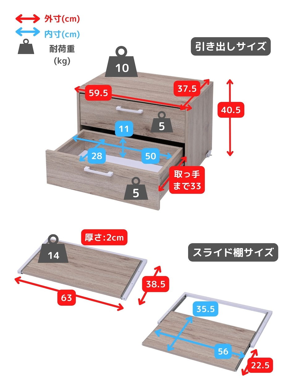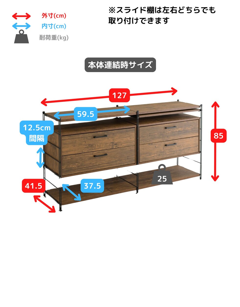 | 商品説明 | ●【取り付け時の注意事項】 ※重い商品ですので、必ず2人以上で設置してください。 ※本体フレームの桟、下から4段目までの間に引き出しのフックを引っかけてください。 ※クロスバーと重なる位置には取り付け付けづらい場合があります。 ※引き出しを2段同時に引き出さないでください。 ※キャスターと併用はできません。 ●幅65cmのウッドシェルフ本体とオプションパーツを合わせたセット 【セット内容】 ウッドシェルフ本体×1 2段引き出し×2 スライド棚×1 棚×1 クロスバー×1 支柱×1 【ウッドシェルフ本体】 ●モノに合わせて棚の位置を変えられる木製棚板のスチールラック ●インボックスなど収納ボックスが縦にすっぽり収まるサイズ設計 ●棚板は木の質感があってお手入れもかんたんな、合成樹脂化粧繊維板 ●軽くて強いフラッシュ構造で、1段あたり25kgの耐荷重 ●フックでフレームに引っ掛けるだけなので、位置の変更もかんたん 【2段引き出し】 ●レール式でスムーズな開閉 ●奥のものまで見やすいフルオープン式 ●カトラリー、食品、お皿、お鍋などが収納しやすいサイズ ●リビングや寝室で衣類や小物収納にも使える ●スライド幅:31cm(取っ手含む33cm) ●耐荷重: 天板10kg、引き出し1段当たり5kg ●サイズ:幅59.5×奥行き37.5×高さ40.5cm 重量18.5kg ●内寸: 幅50×奥行き28×深さ11cm 【スライド棚】 ●レール式でスムーズな開閉 ●棚板の下に付けるとちょい置きできるトレーに ●木の質感があってお手入れもかんたん ●スライド幅: 22cm ●耐荷重: 14kg ●サイズ: 幅63×奥行き38.5×高さ2cm 重量4kg ●内寸: 幅56×奥行き33.5cm 【棚】 ●サイズ:幅59.5×奥行き37.5×高さ2.5cm 重量3kg ●耐荷重:1段あたり25kg 【クロスバー】 ●サイズ: 92.5 重量0.6kg 【支柱】 ●サイズ: 幅2×奥行き40×高さ85cm 重量2kg |