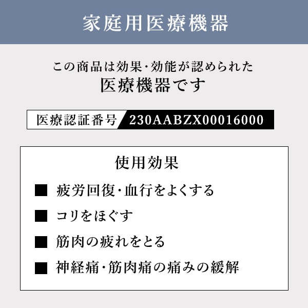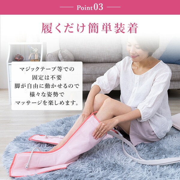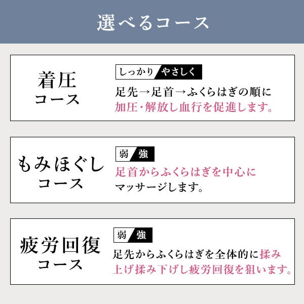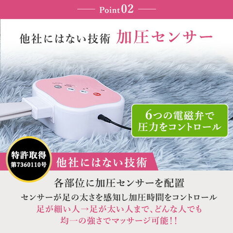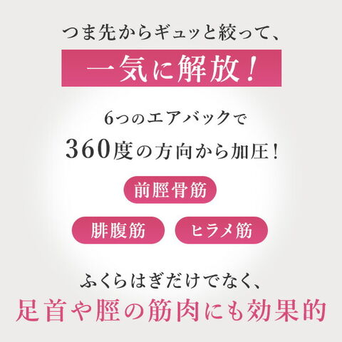 | 商品説明 | ●医療機器認証番号:230AABZX00016000 ●適応足サイズ:22~28cmまで ●適応ふくらはぎ周長:32~40cmまで●電気定格:AC100V 50-60Hz ●本体定格電圧:DC12V ●オートタイマー:約15分 ●電源コード長さ:約1.8m ●エアホース長さ:0.8m ●脚のむくみ、ふくらはぎの疲れが気になる方におすすめ ●6つのエアバッグで360度の方向から加圧、足首や脛の筋肉にも効果的 ●各部位に加圧センサーを配置しており、どんな人でも均一の強さでマッサージ可能 ●マジックテープ等で固定する必要がないため様々な姿勢でマッサージを楽しめる ●選べるコース:着圧コース/もみほぐしコース/疲労回復コース ●部位:足先/足首/ふくらはぎ |